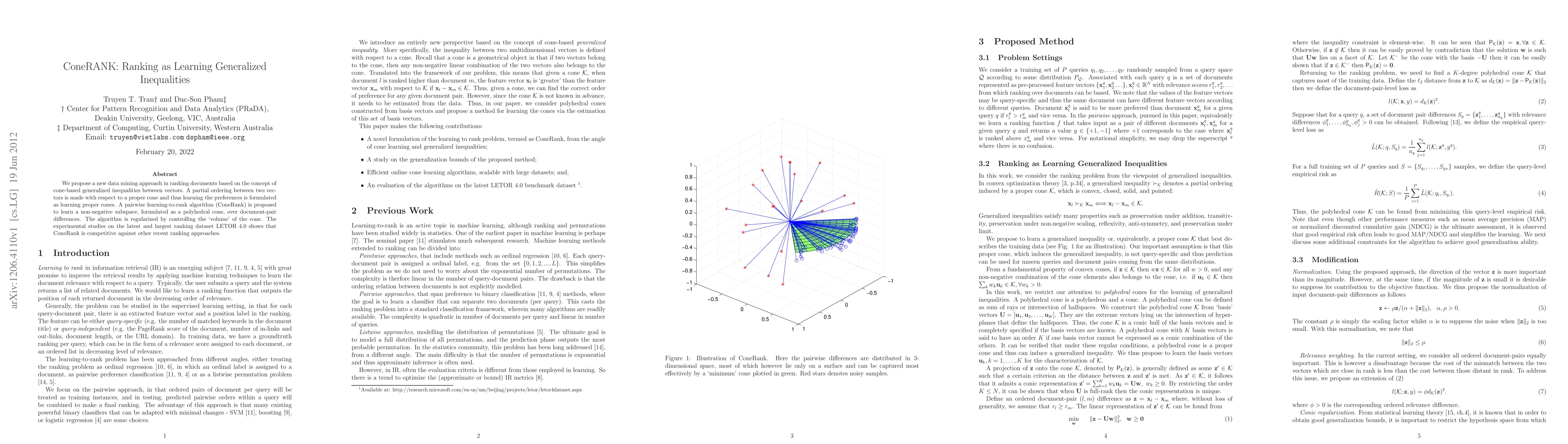 A new approach called ConeRANK proposes learning proper cones to rank documents based on generalized inequalities between vectors, showing competitive results in the LETOR 4.0 dataset.