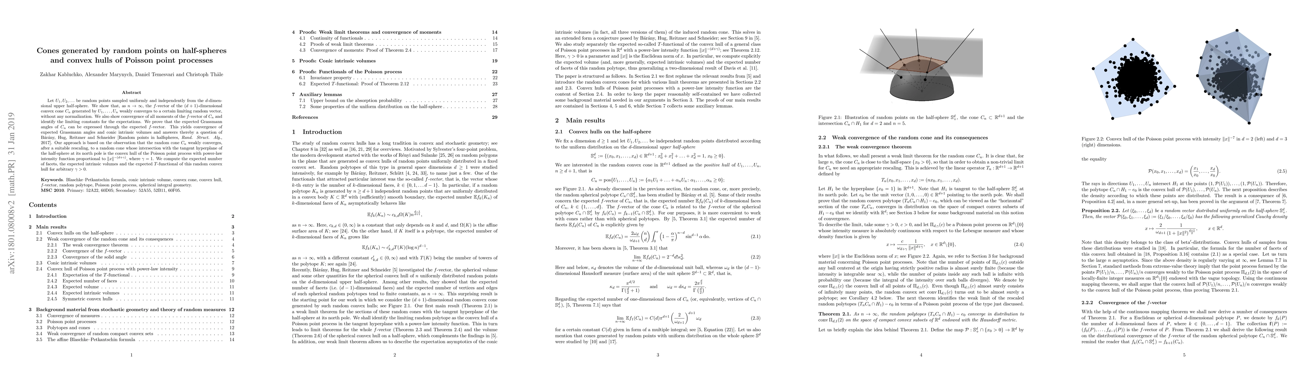 Let $U_1,U_2,\ldots$ be random points sampled uniformly and independently from the $d$-dimensional upper half-sphere. We show that, as $n\to\infty$, the $f$-vector of the $(d+1)$-dimensional convex cone $C_n$ generated by $U_1,\ldots,U_n$ weakly converges to a certain limiting random vector, without any normalization. We also show convergence of all moments of the $f$-vector of $C_n$ and identify the limiting constants for the expectations. We prove that the expected Grassmann angles of $C_n$ can be expressed through the expected $f$-vector. This yields convergence of expected Grassmann angles and conic intrinsic volumes and answers thereby a question of B\'ar\'any, Hug, Reitzner and Schneider [Random points in halfspheres, Rand. Struct. Alg., 2017]. Our approach is based on the observation that the random cone $C_n$ weakly converges, after a suitable rescaling, to a random cone whose intersection with the tangent hyperplane of the half-sphere at its north pole is the convex hull of the Poisson point process with power-law intensity function proportional to $\|x\|^{-(d+\gamma)}$, where $\gamma=1$. We compute the expected number of facets, the expected intrinsic volumes and the expected $T$-functional of this random convex hull for arbitrary $\gamma>0$.