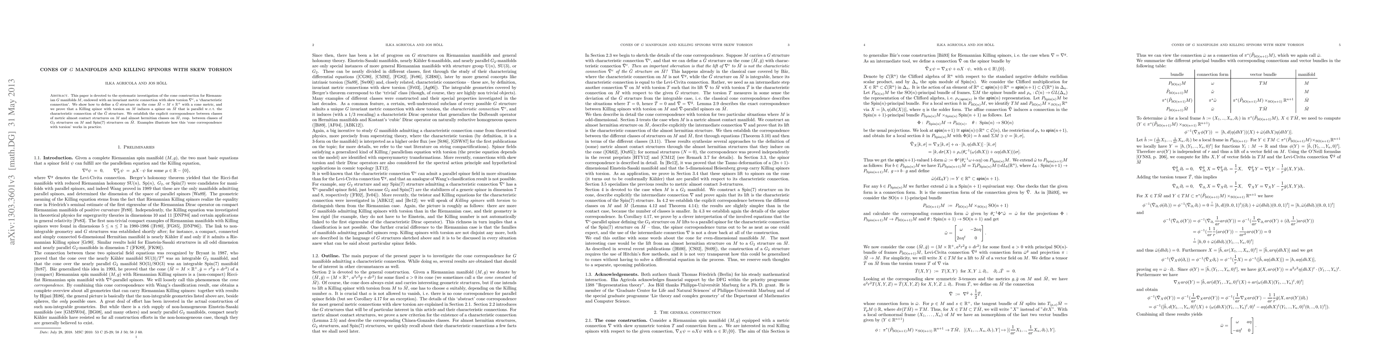 This paper is devoted to the systematic investigation of the cone construction for Riemannian $G$ manifolds M, endowed with an invariant metric connection with skew torsion $\nabla^c$, a `characteristic connection'. We show how to define a $\bar G$ structure on the cone $\bar M=M\x \R^+$ with a cone metric, and we prove that a Killing spinor with torsion on $M$ induces a spinor on $\bar M$ that is parallel w.\,r.\,t. the characteristic connection of the $\bar G$ structure. We establish the explicit correspondence between classes of metric almost contact structures on $M$ and almost hermitian classes on $\bar M$, resp. between classes of $G_2$ structures on $M$ and $\Spin(7)$ structures on $\bar M$. Examples illustrate how this `cone correspondence with torsion' works in practice.