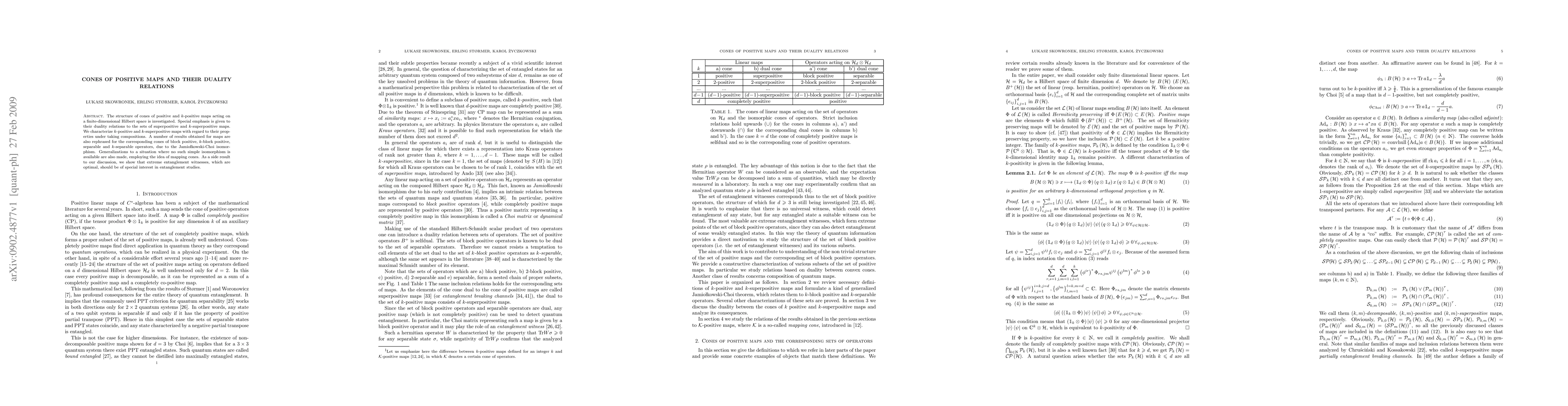 The structure of cones of positive and k-positive maps acting on a finite-dimensional Hilbert space is investigated. Special emphasis is given to their duality relations to the sets of superpositive and k-superpositive maps. We characterize k-positive and k-superpositive maps with regard to their properties under taking compositions. A number of results obtained for maps are also rephrased for the corresponding cones of block positive, k-block positive, separable and k-separable operators, due to the Jamiolkowski-Choi isomorphism. Generalizations to a situation where no such simple isomorphism is available are also made, employing the idea of mapping cones. As a side result to our discussion, we show that extreme entanglement witnesses, which are optimal, should be of special interest in entanglement studies.