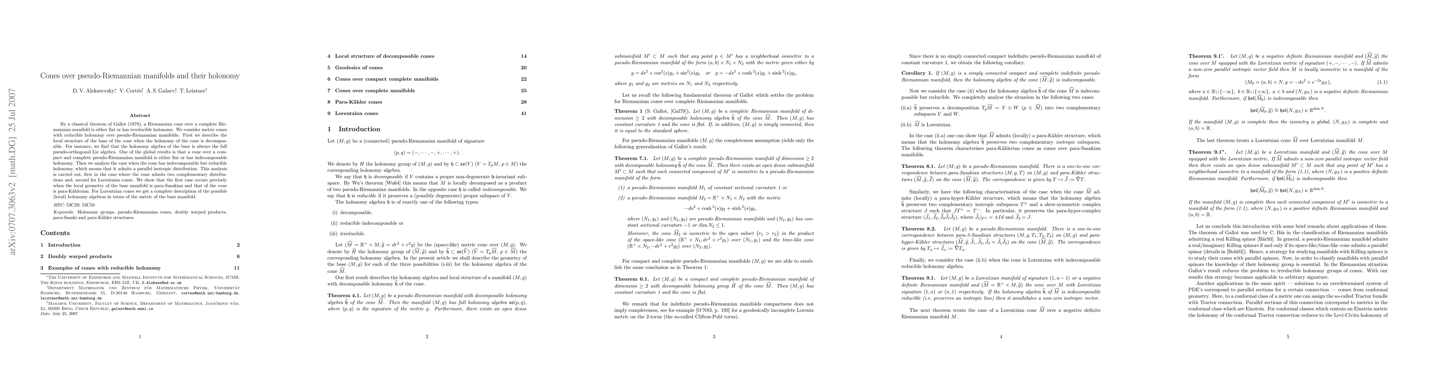This research paper explores metric cones over pseudo-Riemannian manifolds with reducible holonomy, detailing their local and global structures. It establishes that a cone over a compact pseudo-Riemannian manifold is either flat or has indecomposable holonomy, and analyzes cases with reducible holonomy, particularly identifying para-Sasakian bases and providing a complete description of local holonomy algebras for Lorentzian cones.