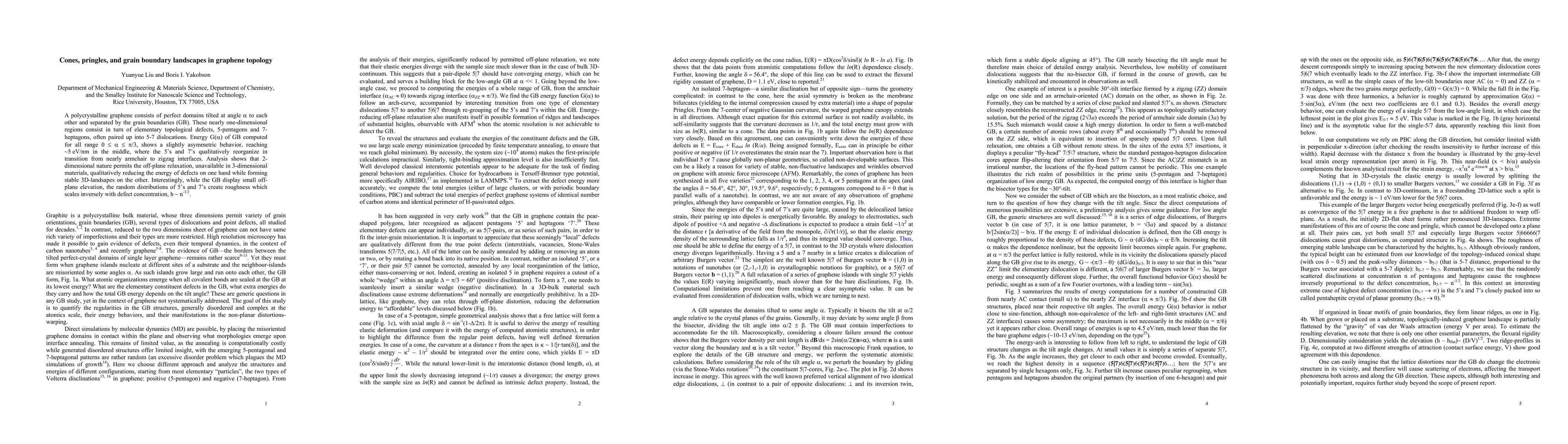 A polycrystalline graphene consists of perfect domains tilted at angle {\alpha} to each other and separated by the grain boundaries (GB). These nearly one-dimensional regions consist in turn of elementary topological defects, 5-pentagons and 7-heptagons, often paired up into 5-7 dislocations. Energy G({\alpha}) of GB computed for all range 0<={\alpha}<=Pi/3, shows a slightly asymmetric behavior, reaching ~5 eV/nm in the middle, where the 5's and 7's qualitatively reorganize in transition from nearly armchair to zigzag interfaces. Analysis shows that 2-dimensional nature permits the off-plane relaxation, unavailable in 3-dimensional materials, qualitatively reducing the energy of defects on one hand while forming stable 3D-landsapes on the other. Interestingly, while the GB display small off-plane elevation, the random distributions of 5's and 7's create roughness which scales inversely with defect concentration, h ~ n^(-1/2)