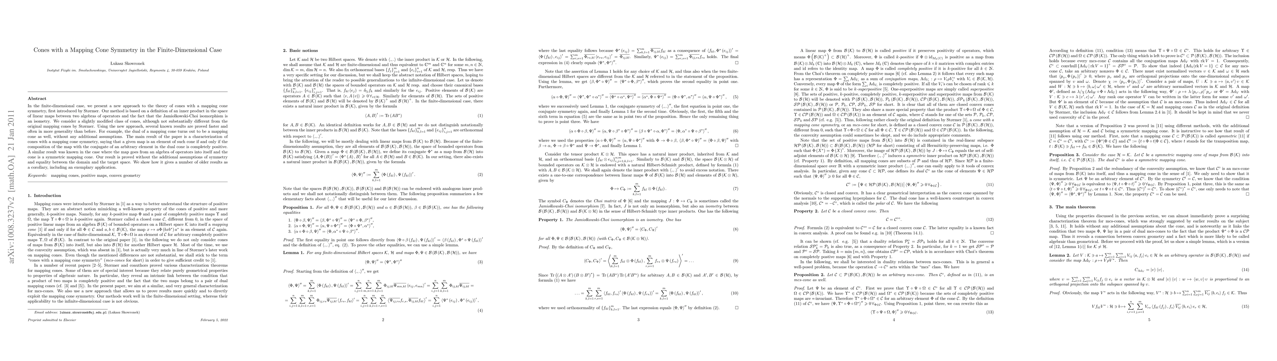 In the finite-dimensional case, we present a new approach to the theory of cones with a mapping cone symmetry, first introduced by St{\o}rmer. Our method is based on a definition of an inner product in the space of linear maps between two algebras of operators and the fact that the Jamio{\l}kowski-Choi isomorphism is an isometry. We consider a slightly modified class of cones, although not substantially different from the original mapping cones by St{\o}rmer. Using the new approach, several known results are proved faster and often in more generality than before. For example, the dual of a mapping cone turns out to be a mapping cone as well, without any additional assumptions. The main result of the paper is a characterization of cones with a mapping cone symmetry, saying that a given map is an element of such cone if and only if the composition of the map with the conjugate of an arbitrary element in the dual cone is completely positive. A similar result was known in the case where the map goes from an algebra of operators into itself and the cone is a symmetric mapping cone. Our result is proved without the additional assumptions of symmetry and equality between the domain and the target space. We show how it gives a number of older results as a corollary, including an exemplary application.