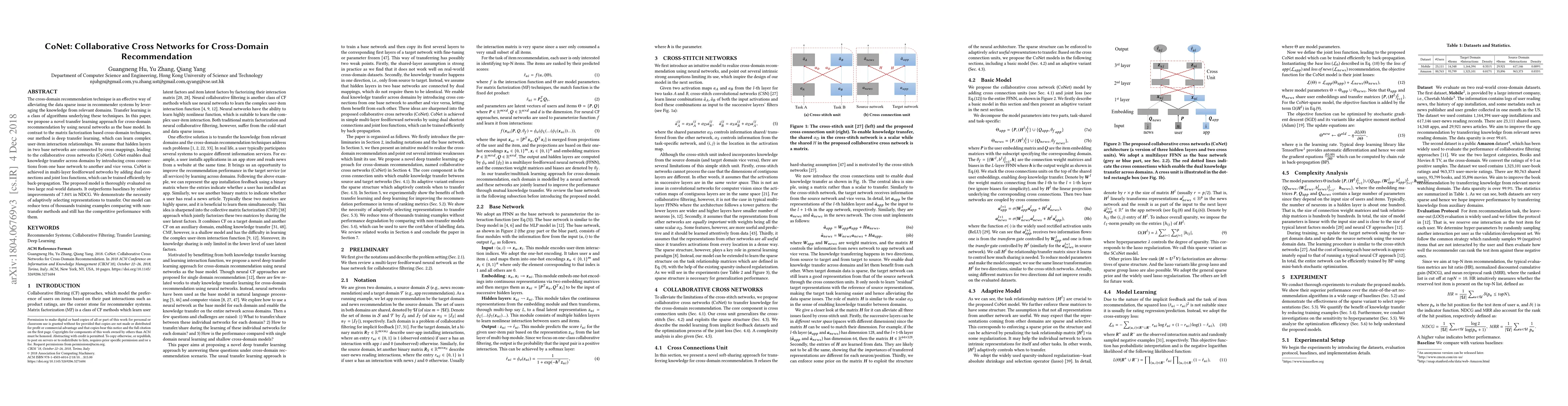 The paper proposes CoNet, a deep transfer learning approach for cross-domain recommendation that leverages neural networks to address data sparsity issues. CoNet uses collaborative cross networks with dual connections and joint loss functions to efficiently transfer knowledge between domains, achieving significant improvements over baselines.