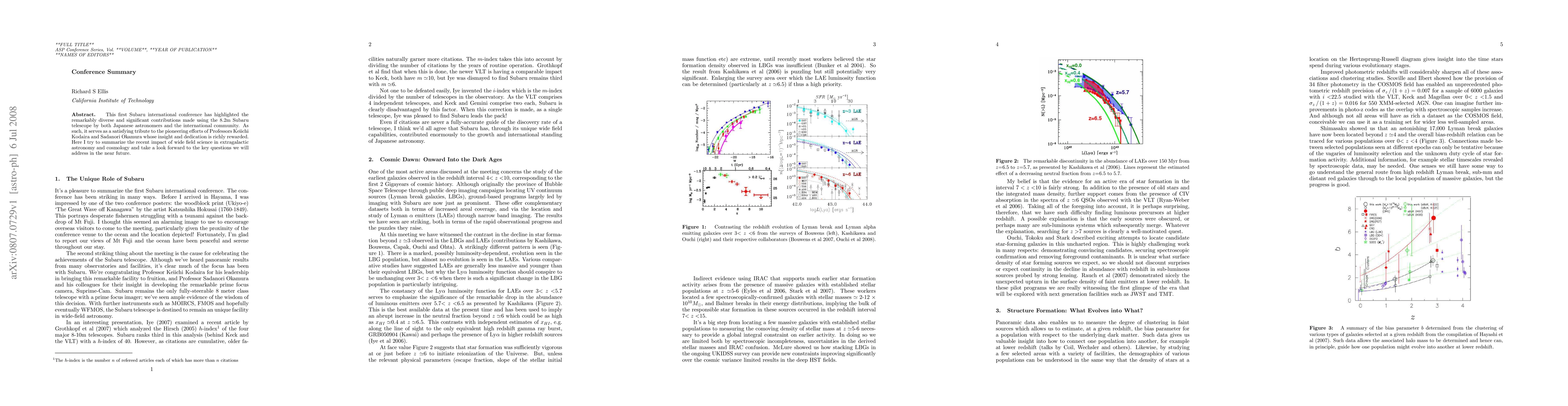The Subaru International Conference highlighted diverse contributions to astronomy using the 8.2m Subaru telescope, focusing on wide field science in extragalactic astronomy and cosmology.