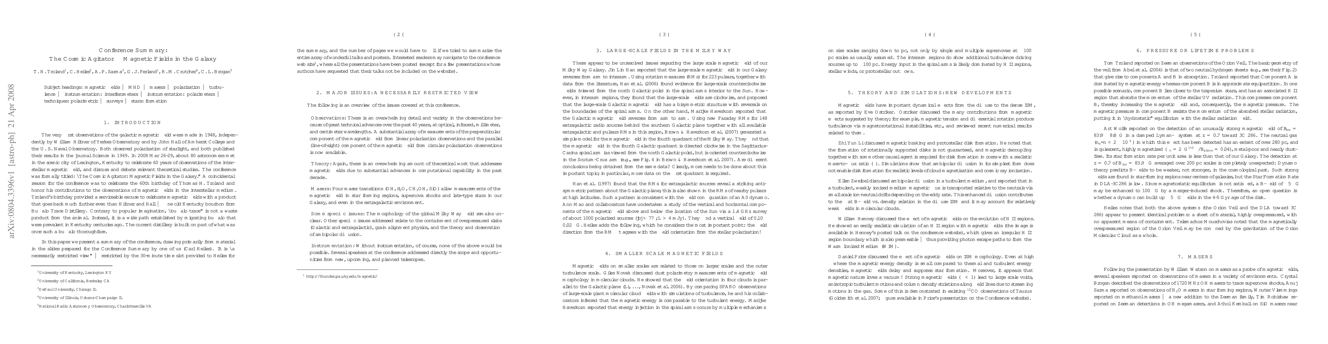 We present a summary of the conference "The Cosmic Agitator: Magnetic Fields in the Galaxy" held in Lexington KY in 2008 Mar 26-29. The presentation draws primarily from material in the slides prepared for the Conference Summary by one of us (Carl Heiles). Interested readers may navigate to the conference web site given in the paper to view the posted presentations in detail.