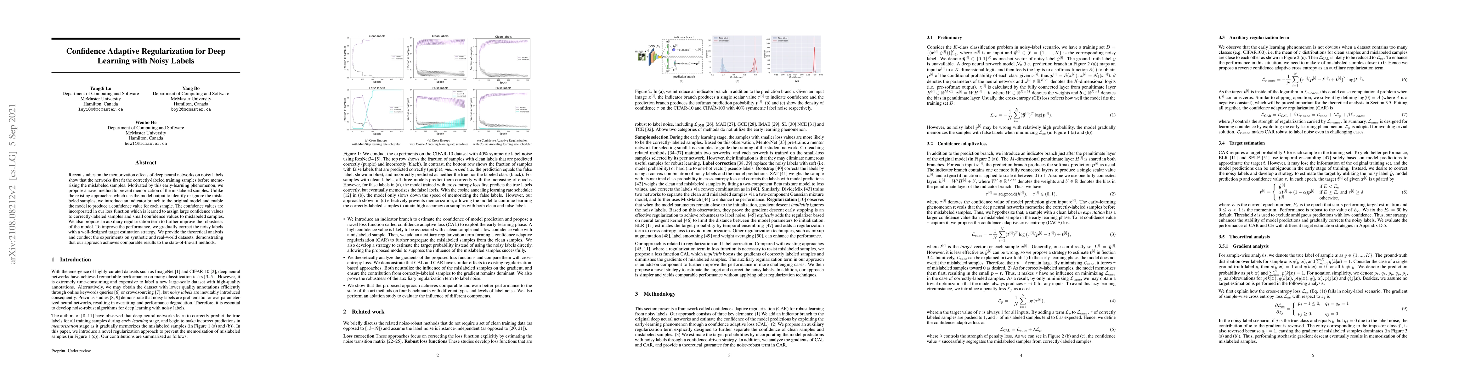 This paper proposes a confidence adaptive regularization method to mitigate memorization of mislabeled samples in deep learning. It introduces an indicator branch to generate confidence values, which are used to adjust the loss function, and an auxiliary regularization term to enhance model robustness. The approach also includes a target estimation strategy to correct noisy labels, achieving competitive performance on both synthetic and real datasets.