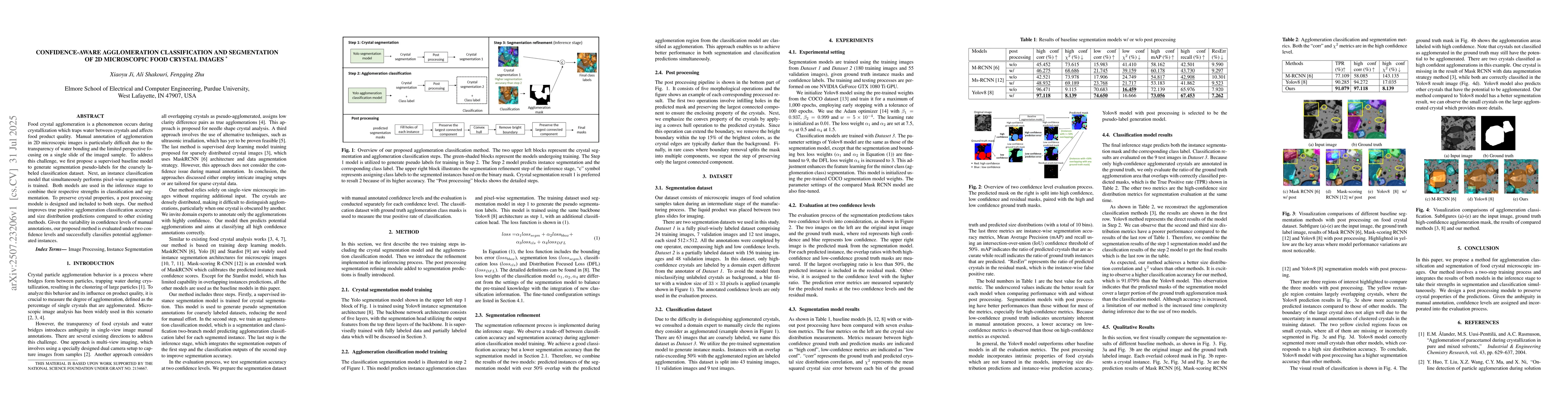 Food crystal agglomeration is a phenomenon occurs during crystallization which traps water between crystals and affects food product quality. Manual annotation of agglomeration in 2D microscopic images is particularly difficult due to the transparency of water bonding and the limited perspective focusing on a single slide of the imaged sample. To address this challenge, we first propose a supervised baseline model to generate segmentation pseudo-labels for the coarsely labeled classification dataset. Next, an instance classification model that simultaneously performs pixel-wise segmentation is trained. Both models are used in the inference stage to combine their respective strengths in classification and segmentation. To preserve crystal properties, a post processing module is designed and included to both steps. Our method improves true positive agglomeration classification accuracy and size distribution predictions compared to other existing methods. Given the variability in confidence levels of manual annotations, our proposed method is evaluated under two confidence levels and successfully classifies potential agglomerated instances.