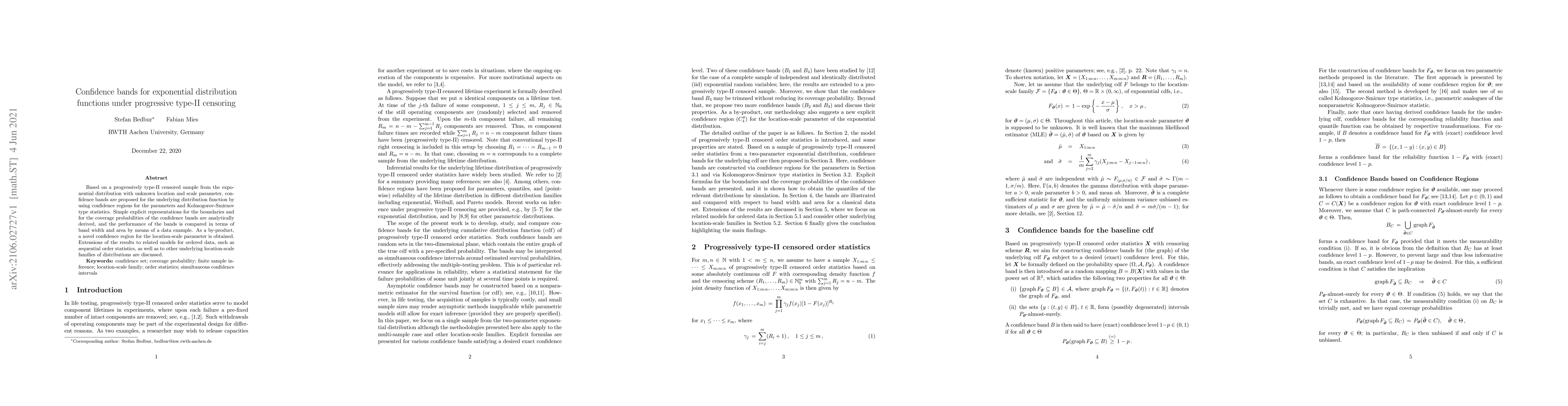 This paper proposes confidence bands for the exponential distribution function under progressive type-II censoring, utilizing confidence regions for parameters and Kolmogorov-Smirnov statistics. The study derives explicit representations for band boundaries and coverage probabilities, and evaluates the bands' performance through a data example.