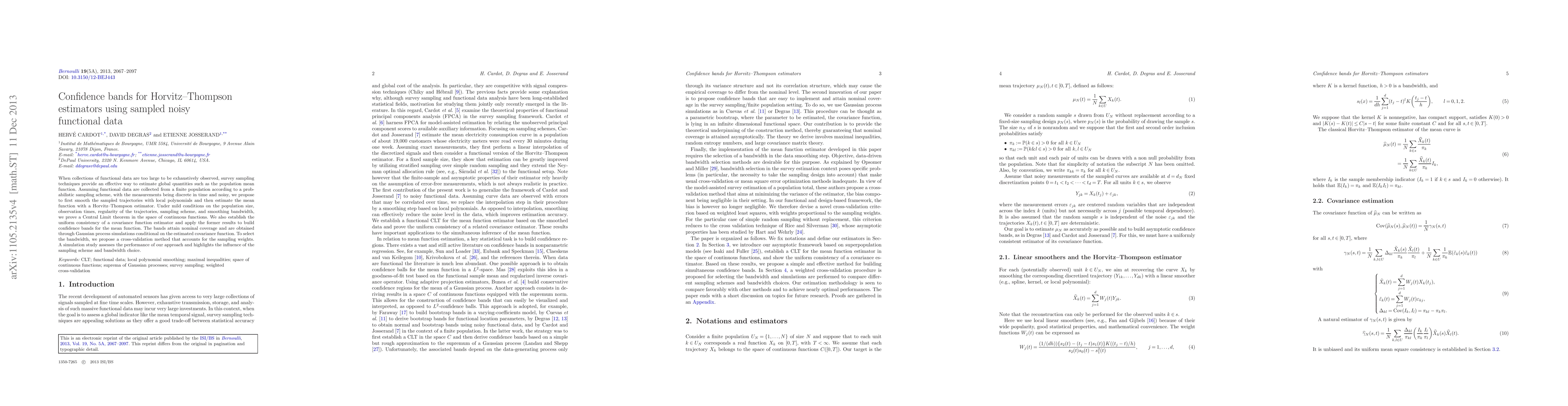 This paper proposes a method for estimating confidence bands for Horvitz-Thompson estimators using sampled noisy functional data. It employs local polynomial smoothing and Gaussian process simulations to obtain the bands, ensuring nominal coverage and assessing performance through a simulation study.