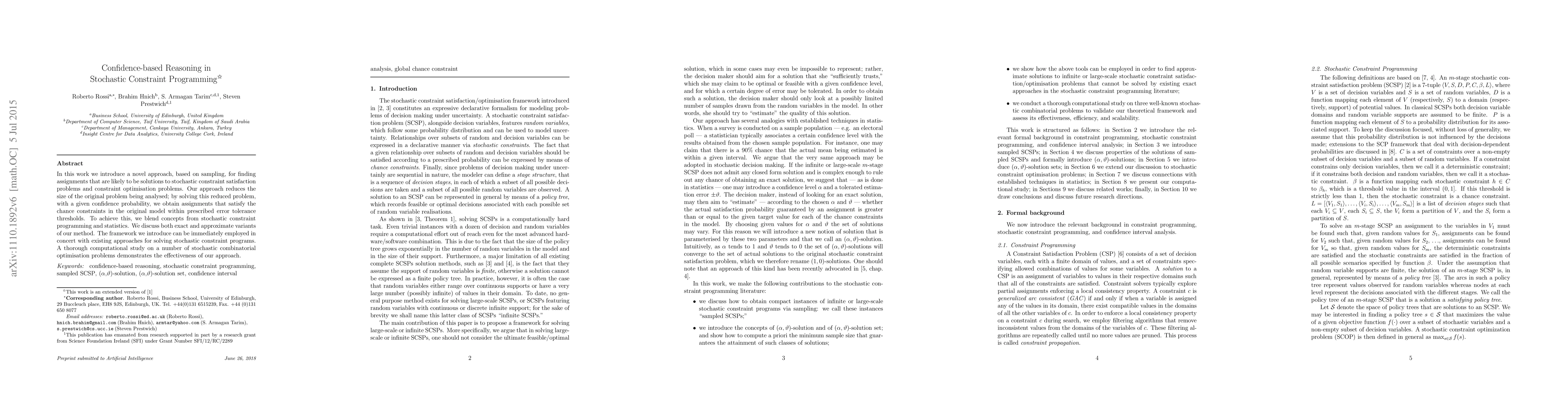 This paper presents a novel sampling-based method for solving stochastic constraint satisfaction problems, reducing problem size while ensuring solutions meet chance constraints within error tolerances. The approach combines stochastic constraint programming with statistical concepts, offering both exact and approximate variants, and is shown effective through computational studies on combinatorial optimisation problems.