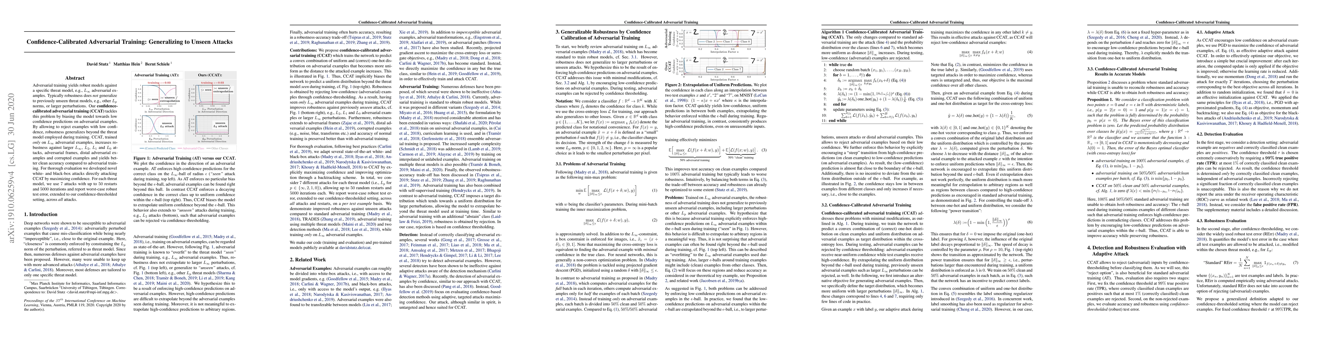 This paper proposes confidence-calibrated adversarial training (CCAT) to enhance model robustness against unseen adversarial attacks by focusing on low-confidence predictions. CCAT generalizes robustness beyond the specific threat model used during training, improving defenses against various $L_p$ norms and other attack types while maintaining clean accuracy.