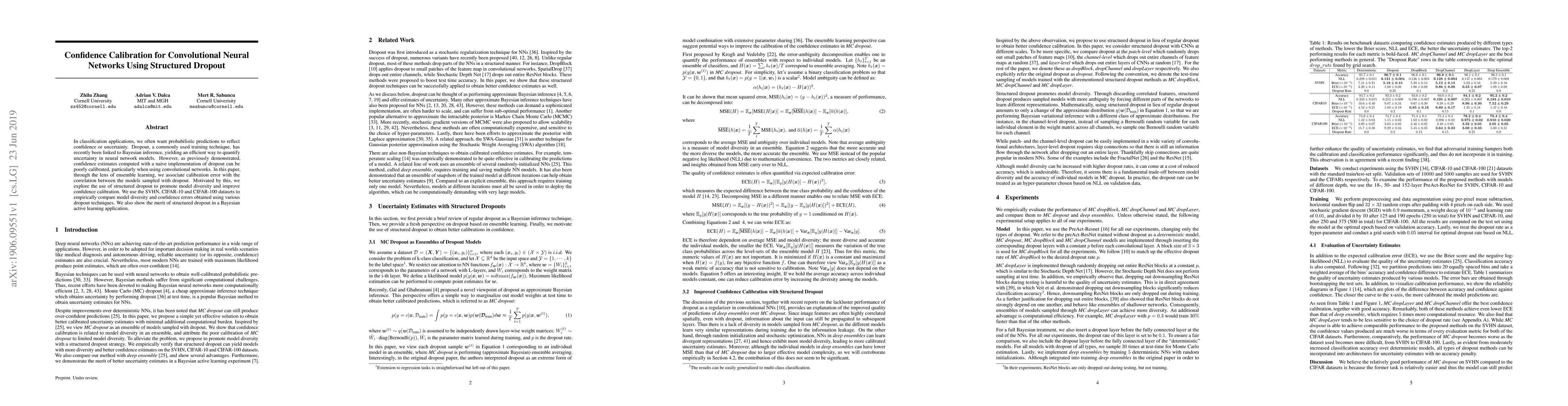 This paper investigates improving confidence calibration in convolutional neural networks using structured dropout, addressing the issue of poorly calibrated confidence estimates from traditional dropout methods. Structured dropout enhances model diversity, leading to better calibration, as demonstrated through empirical comparisons on SVHN, CIFAR-10, and CIFAR-100 datasets.