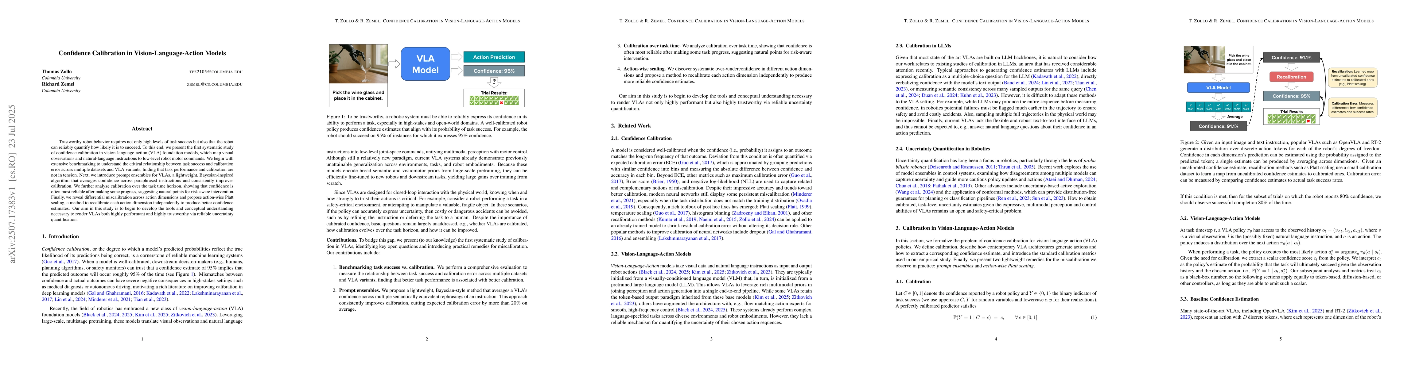 Trustworthy robot behavior requires not only high levels of task success but also that the robot can reliably quantify how likely it is to succeed. To this end, we present the first systematic study of confidence calibration in vision-language-action (VLA) foundation models, which map visual observations and natural-language instructions to low-level robot motor commands. We begin with extensive benchmarking to understand the critical relationship between task success and calibration error across multiple datasets and VLA variants, finding that task performance and calibration are not in tension. Next, we introduce prompt ensembles for VLAs, a lightweight, Bayesian-inspired algorithm that averages confidence across paraphrased instructions and consistently improves calibration. We further analyze calibration over the task time horizon, showing that confidence is often most reliable after making some progress, suggesting natural points for risk-aware intervention. Finally, we reveal differential miscalibration across action dimensions and propose action-wise Platt scaling, a method to recalibrate each action dimension independently to produce better confidence estimates. Our aim in this study is to begin to develop the tools and conceptual understanding necessary to render VLAs both highly performant and highly trustworthy via reliable uncertainty quantification.