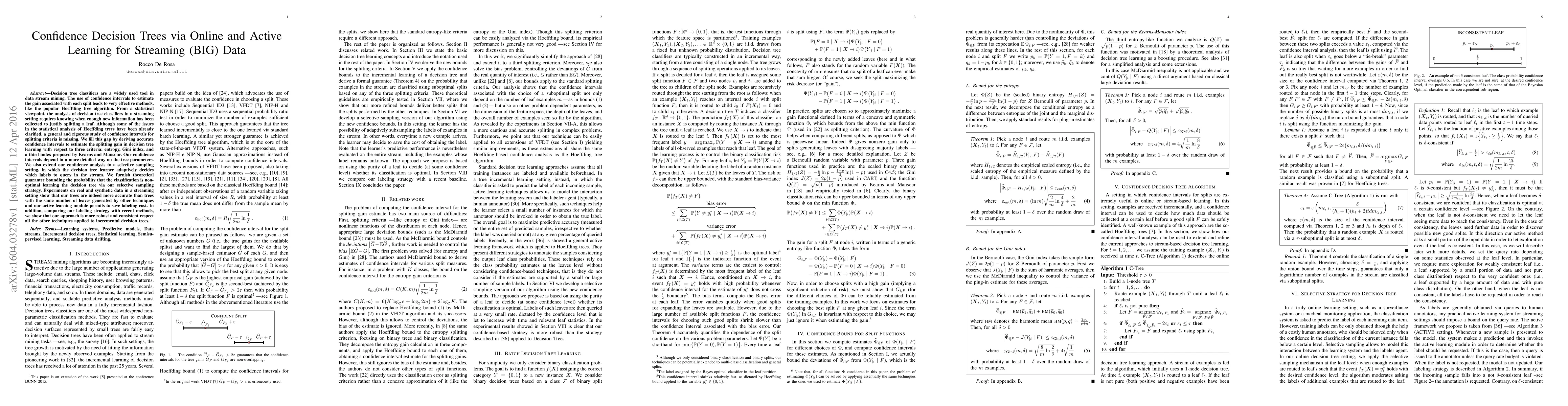 This paper develops confidence decision trees for streaming data using online and active learning, providing accurate confidence intervals for splitting criteria based on entropy, Gini index, and a new index. The proposed method includes a selective sampling strategy for adaptive label querying, demonstrating improved accuracy and labeling cost savings compared to other techniques.