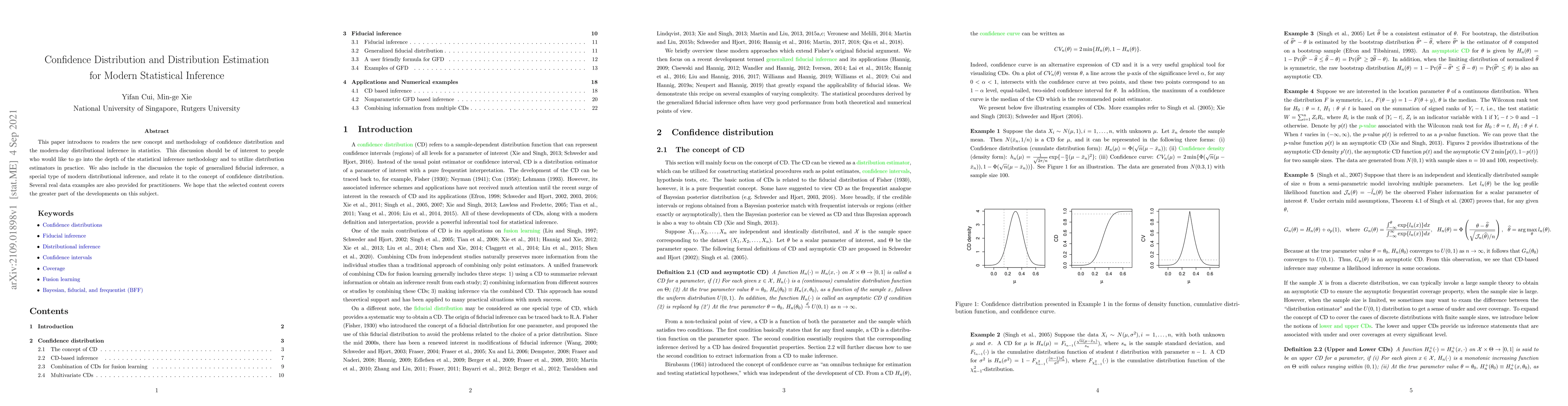 This paper introduces a new concept of confidence distribution for modern statistical inference, providing a methodological framework for distribution estimators and generalized fiducial inference. It offers practical applications through real data examples, aiming to facilitate the adoption of distributional inference in statistics.