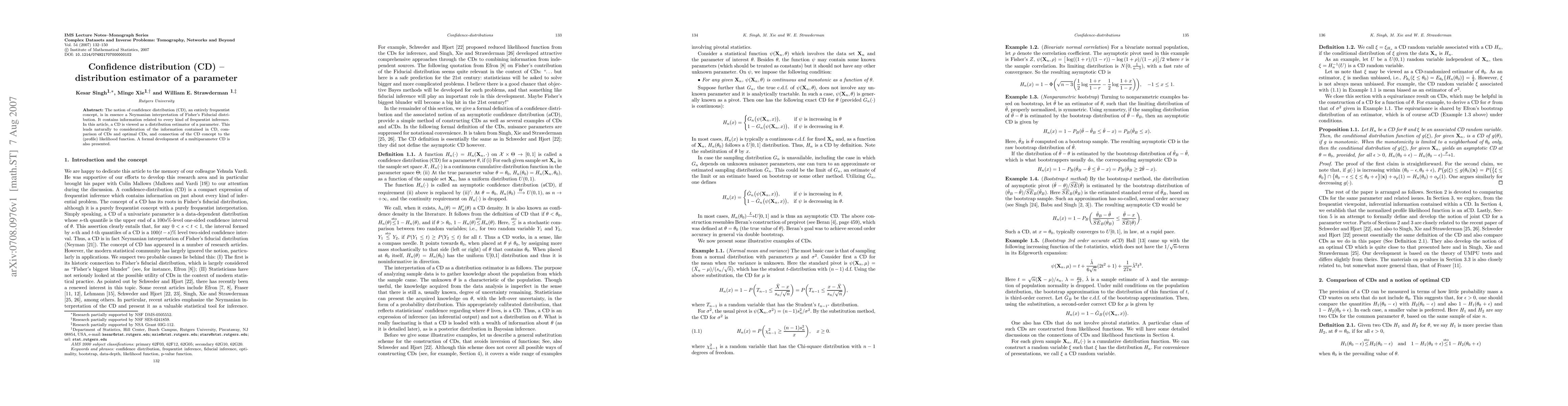 The paper explores confidence distribution (CD) as a frequentist estimator of a parameter, comparing it to Fisher's fiducial distribution and discussing its information content, optimal forms, and connections to the likelihood function, with a formal development for multiparameter cases.