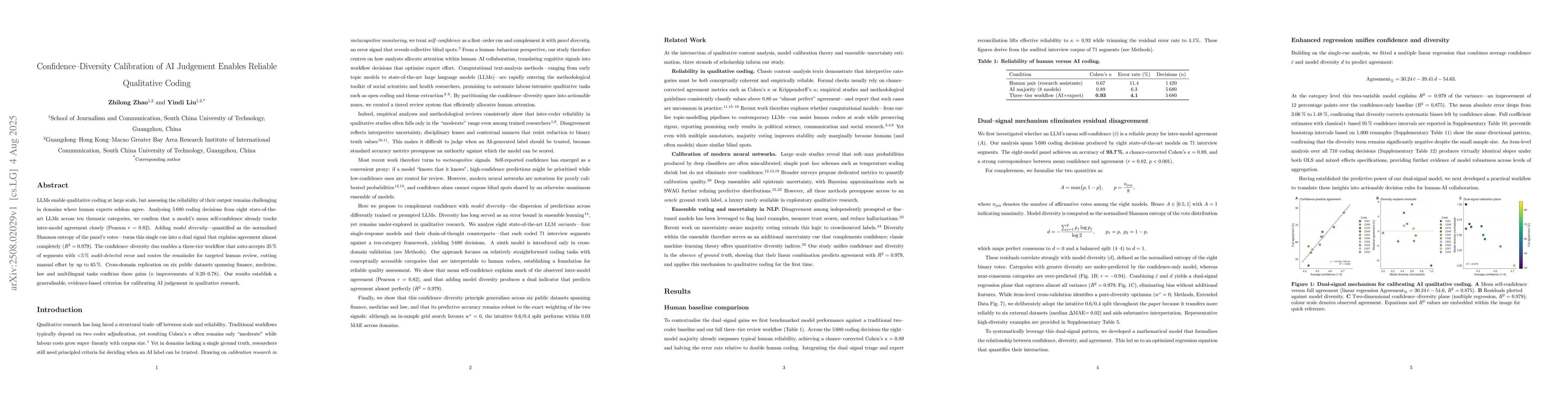 LLMs enable qualitative coding at large scale, but assessing the reliability of their output remains challenging in domains where human experts seldom agree. Analysing 5,680 coding decisions from eight state-of-the-art LLMs across ten thematic categories, we confirm that a model's mean self-confidence already tracks inter-model agreement closely (Pearson r=0.82). Adding model diversity-quantified as the normalised Shannon entropy of the panel's votes-turns this single cue into a dual signal that explains agreement almost completely (R^2=0.979). The confidence-diversity duo enables a three-tier workflow that auto-accepts 35% of segments with <5% audit-detected error and routes the remainder for targeted human review, cutting manual effort by up to 65%. Cross-domain replication on six public datasets spanning finance, medicine, law and multilingual tasks confirms these gains (kappa improvements of 0.20-0.78). Our results establish a generalisable, evidence-based criterion for calibrating AI judgement in qualitative research.
