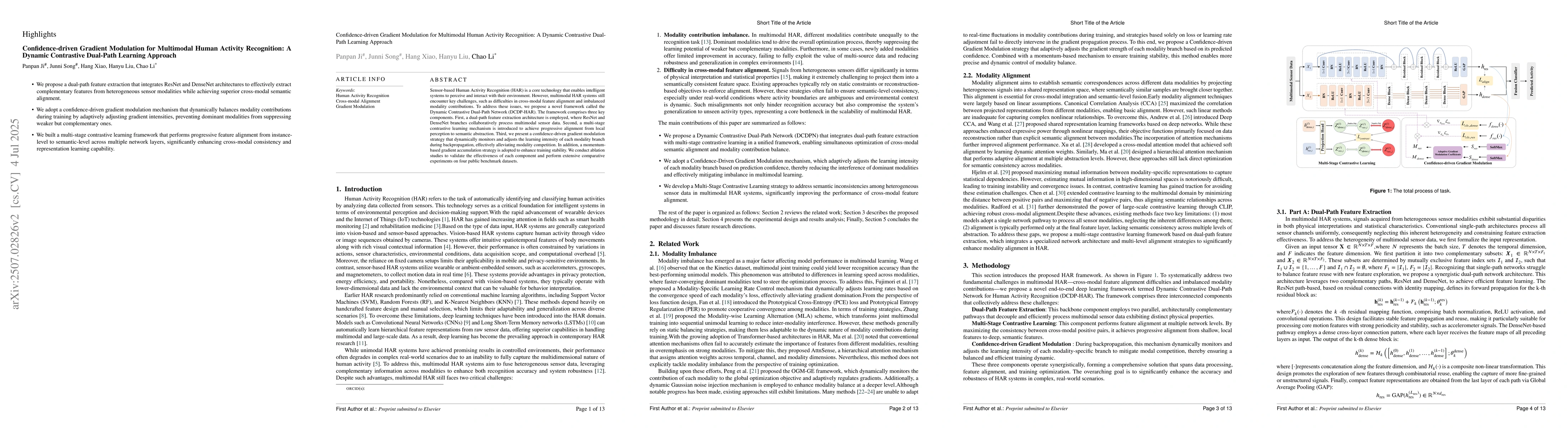 Sensor-based Human Activity Recognition (HAR) is a core technology that enables intelligent systems to perceive and interact with their environment. However, multimodal HAR systems still encounter key challenges, such as difficulties in cross-modal feature alignment and imbalanced modality contributions. To address these issues, we propose a novel framework called the Dynamic Contrastive Dual-Path Network (DCDP-HAR). The framework comprises three key components. First, a dual-path feature extraction architecture is employed, where ResNet and DenseNet branches collaboratively process multimodal sensor data. Second, a multi-stage contrastive learning mechanism is introduced to achieve progressive alignment from local perception to semantic abstraction. Third, we present a confidence-driven gradient modulation strategy that dynamically monitors and adjusts the learning intensity of each modality branch during backpropagation, effectively alleviating modality competition. In addition, a momentum-based gradient accumulation strategy is adopted to enhance training stability. We conduct ablation studies to validate the effectiveness of each component and perform extensive comparative experiments on four public benchmark datasets.