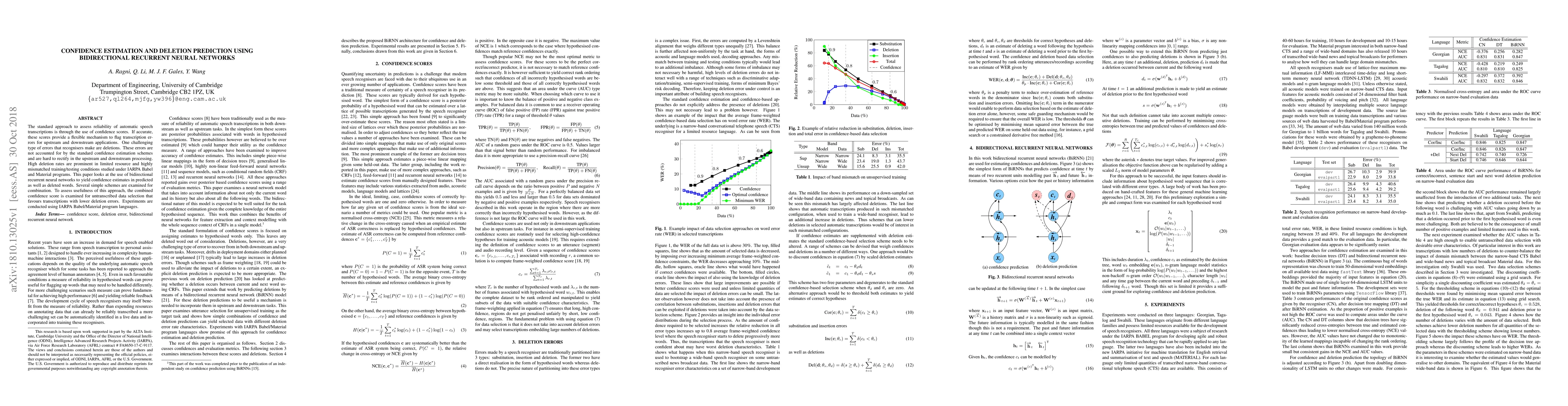 The standard approach to assess reliability of automatic speech transcriptions is through the use of confidence scores. If accurate, these scores provide a flexible mechanism to flag transcription errors for upstream and downstream applications. One challenging type of errors that recognisers make are deletions. These errors are not accounted for by the standard confidence estimation schemes and are hard to rectify in the upstream and downstream processing. High deletion rates are prominent in limited resource and highly mismatched training/testing conditions studied under IARPA Babel and Material programs. This paper looks at the use of bidirectional recurrent neural networks to yield confidence estimates in predicted as well as deleted words. Several simple schemes are examined for combination. To assess usefulness of this approach, the combined confidence score is examined for untranscribed data selection that favours transcriptions with lower deletion errors. Experiments are conducted using IARPA Babel/Material program languages.