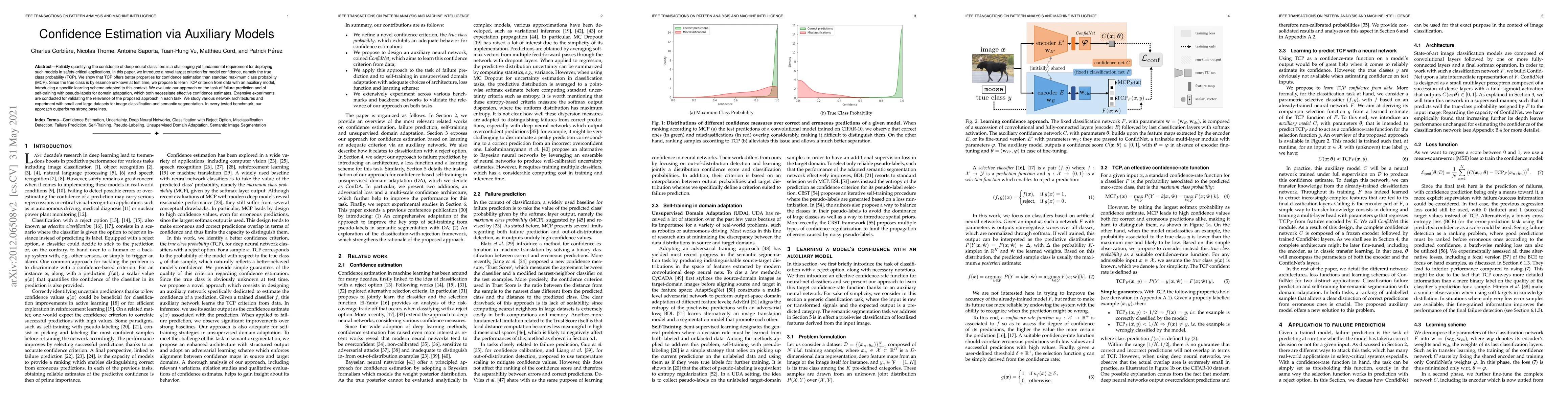 Reliably quantifying the confidence of deep neural classifiers is a challenging yet fundamental requirement for deploying such models in safety-critical applications. In this paper, we introduce a novel target criterion for model confidence, namely the true class probability (TCP). We show that TCP offers better properties for confidence estimation than standard maximum class probability (MCP). Since the true class is by essence unknown at test time, we propose to learn TCP criterion from data with an auxiliary model, introducing a specific learning scheme adapted to this context. We evaluate our approach on the task of failure prediction and of self-training with pseudo-labels for domain adaptation, which both necessitate effective confidence estimates. Extensive experiments are conducted for validating the relevance of the proposed approach in each task. We study various network architectures and experiment with small and large datasets for image classification and semantic segmentation. In every tested benchmark, our approach outperforms strong baselines.