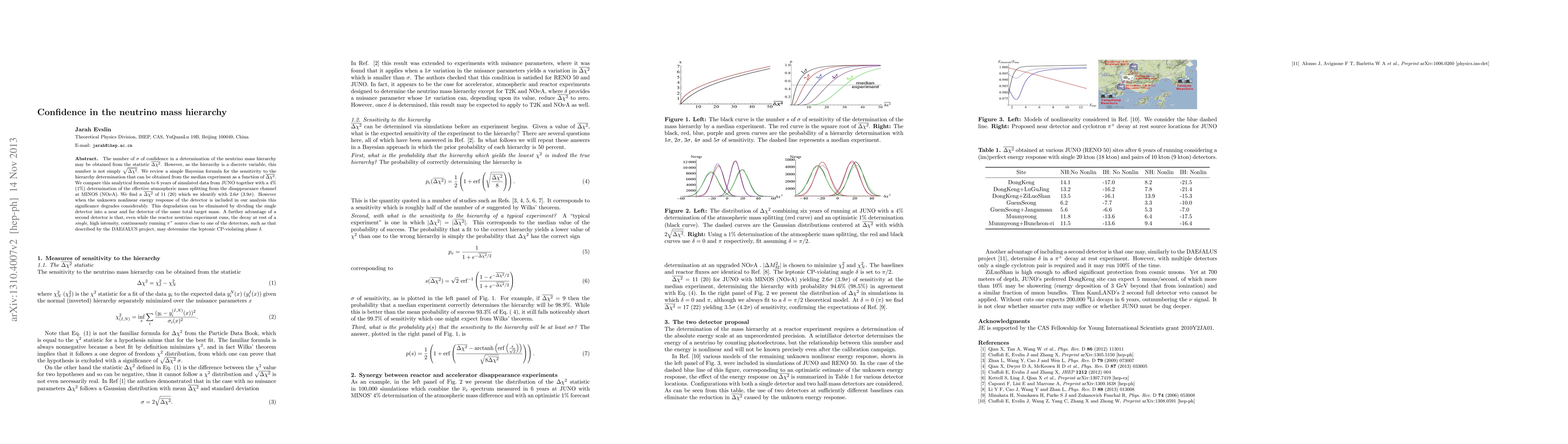 The number of sigma of confidence in a determination of the neutrino mass hierarchy may be obtained from the statistic Delta chi squared. However, as the hierarchy is a discrete variable, this number is not given by the usual square root formula. We review a simple Bayesian formula for the sensitivity to the hierarchy that can be obtained from the median experiment as a function of Delta chi squared. We compare this analytical formula to 6 years of simulated data from JUNO together with a 4% (1%) determination of the effective atmospheric mass splitting from the disappearance channel at MINOS (NOvA). We find a Delta chi squared of 11 (20) yielding 2.6 sigma (3.9 sigma). However when the unknown nonlinear energy response of the detector is included in our analysis this significance degrades considerably. This degradation can be eliminated by dividing the single detector into a near and far detector of the same total target mass. A further advantage of a second detector is that, even while the reactor neutrino experiment runs, the decay at rest of a single, high intensity, continuously running pion source close to one of the detectors, such as that described by the DAEdALUS project, may determine the leptonic CP-violating phase delta.