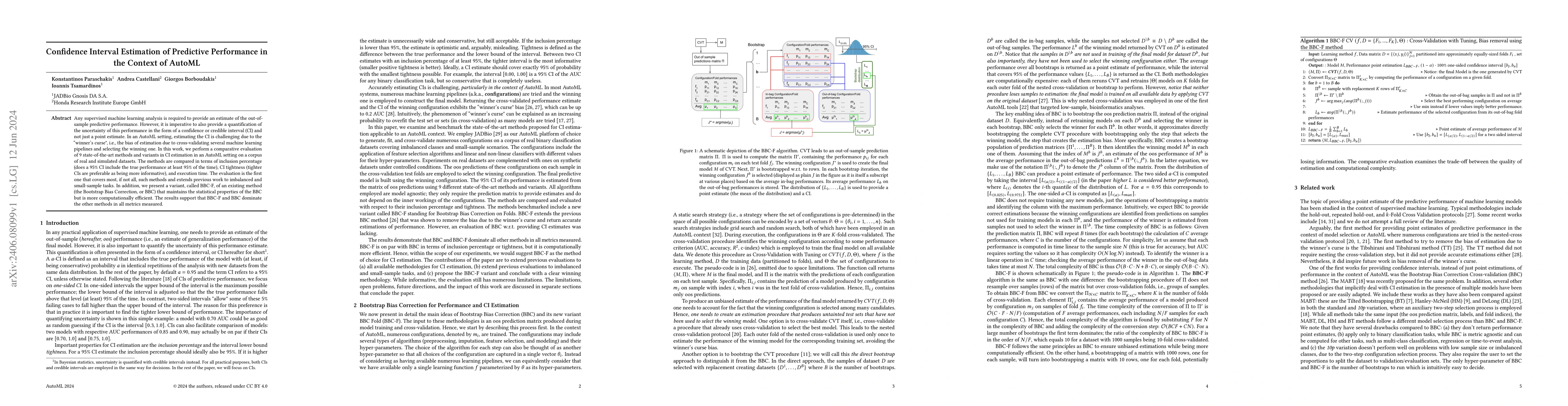 This paper evaluates nine state-of-the-art methods for estimating confidence intervals in AutoML, addressing the "winner's curse" bias. The results show that the proposed BBC-F variant outperforms others in coverage accuracy, interval tightness, and computational efficiency.
