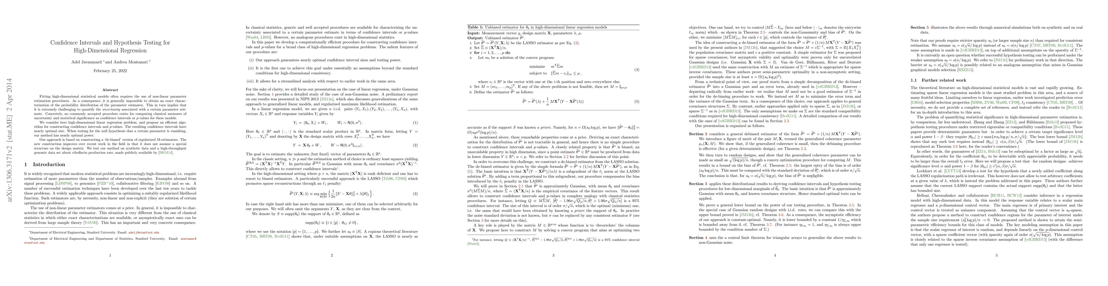 Fitting high-dimensional statistical models often requires the use of non-linear parameter estimation procedures. As a consequence, it is generally impossible to obtain an exact characterization of the probability distribution of the parameter estimates. This in turn implies that it is extremely challenging to quantify the \emph{uncertainty} associated with a certain parameter estimate. Concretely, no commonly accepted procedure exists for computing classical measures of uncertainty and statistical significance as confidence intervals or $p$-values for these models. We consider here high-dimensional linear regression problem, and propose an efficient algorithm for constructing confidence intervals and $p$-values. The resulting confidence intervals have nearly optimal size. When testing for the null hypothesis that a certain parameter is vanishing, our method has nearly optimal power. Our approach is based on constructing a `de-biased' version of regularized M-estimators. The new construction improves over recent work in the field in that it does not assume a special structure on the design matrix. We test our method on synthetic data and a high-throughput genomic data set about riboflavin production rate.