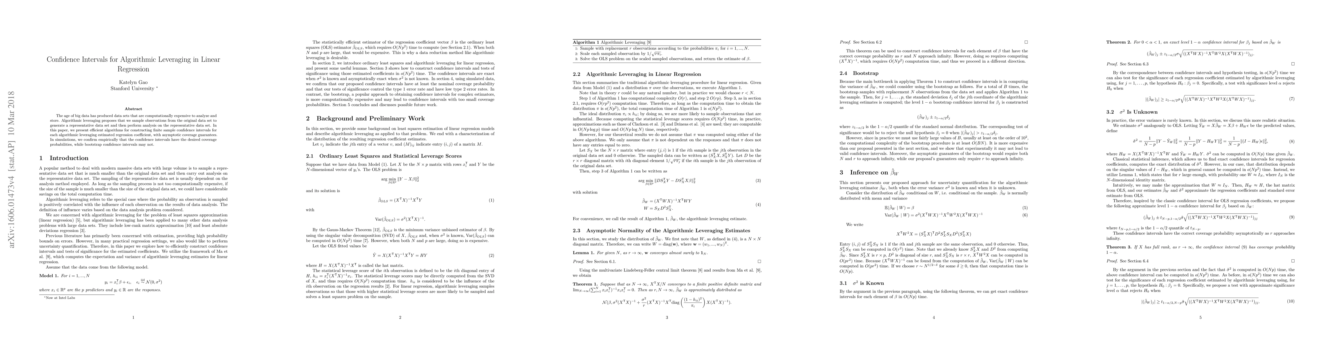 The age of big data has produced data sets that are computationally expensive to analyze and store. Algorithmic leveraging proposes that we sample observations from the original data set to generate a representative data set and then perform analysis on the representative data set. In this paper, we present efficient algorithms for constructing finite sample confidence intervals for each algorithmic leveraging estimated regression coefficient, with asymptotic coverage guarantees. In simulations, we confirm empirically that the confidence intervals have the desired coverage probabilities, while bootstrap confidence intervals may not.