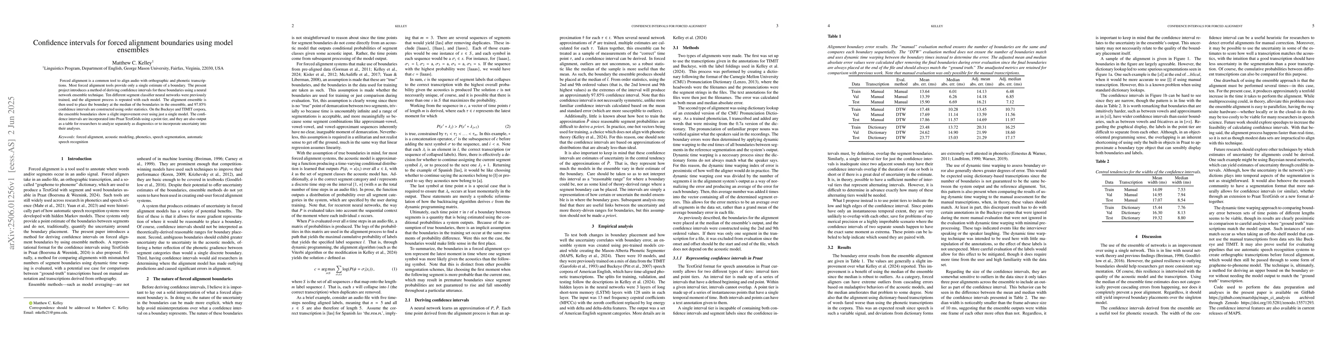 Researchers developed a method to create confidence intervals for audio alignment boundaries using neural network ensembles, showing a slight improvement over single-model estimates on two corpora. This allows for more accurate analysis of transcription accuracy.