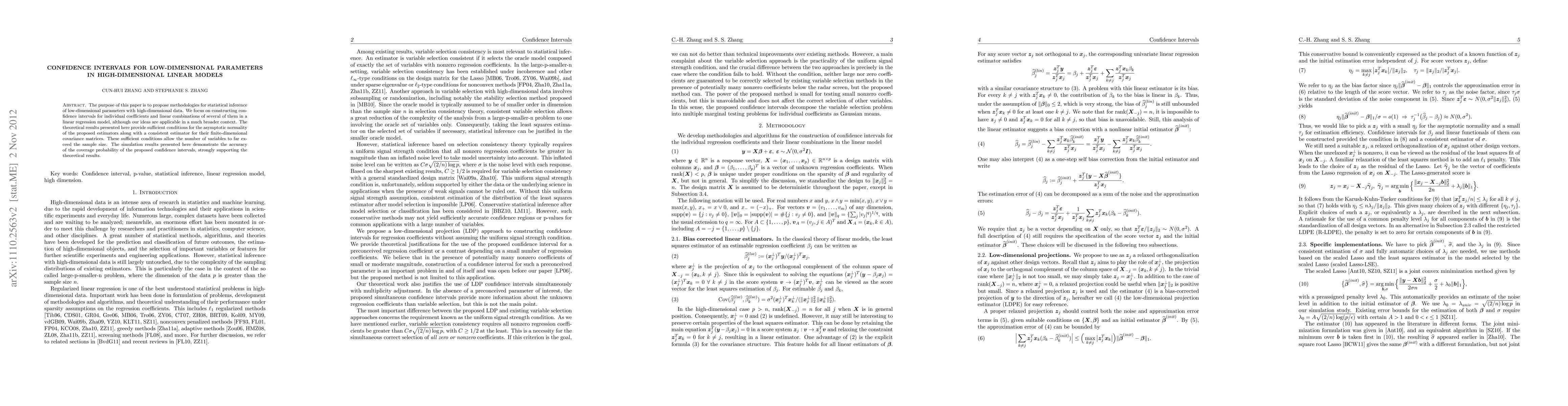 This paper proposes methodologies for constructing confidence intervals for low-dimensional parameters in high-dimensional linear models, ensuring asymptotic normality and accurate coverage probability even when the number of variables exceeds the sample size. Theoretical results are supported by simulation studies.