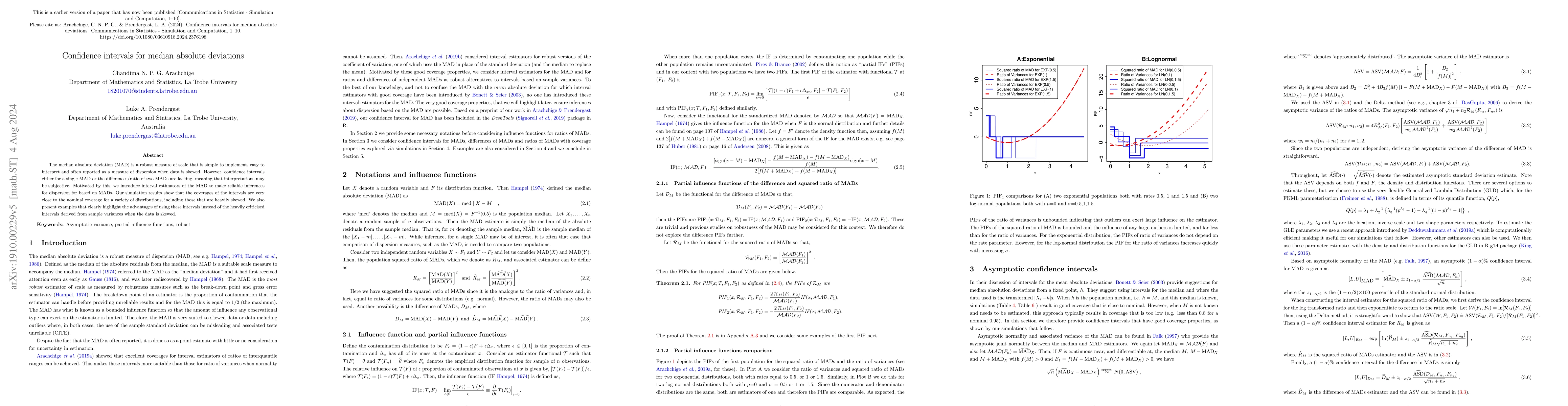 The median absolute deviation (MAD) is a robust measure of scale that is simple to implement and easy to interpret. Motivated by this, we introduce interval estimators of the MAD to make reliable inferences for dispersion for a single population and ratios and differences of MADs for comparing two populations. Our simulation results show that the coverage probabilities of the intervals are very close to the nominal coverage for a variety of distributions. We have used partial influence functions to investigate the robustness properties of the difference and ratios of independent MADs.