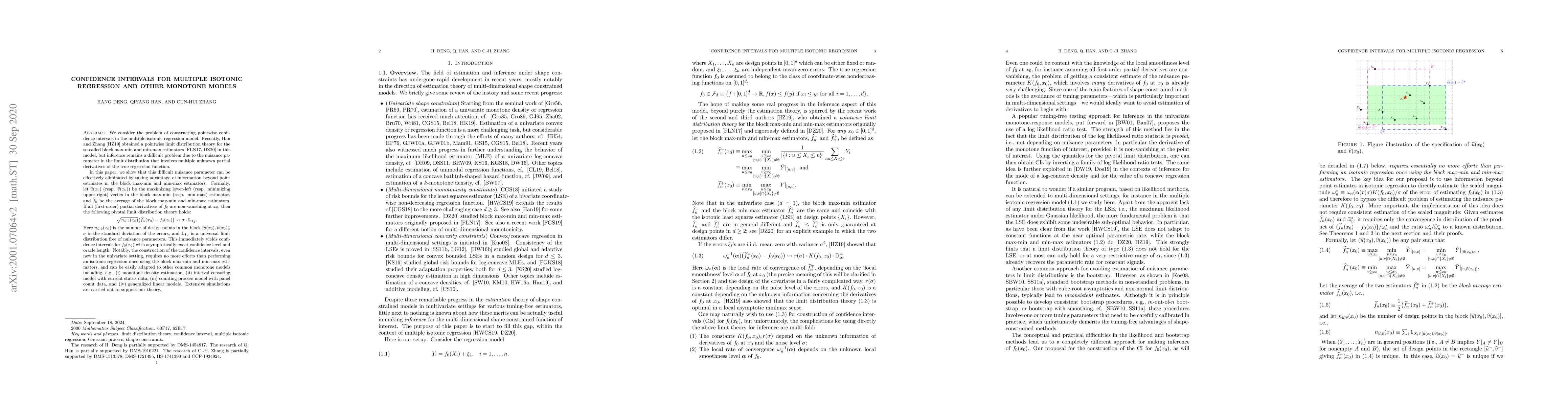 We consider the problem of constructing pointwise confidence intervals in the multiple isotonic regression model. Recently, [HZ19] obtained a pointwise limit distribution theory for the so-called block max-min and min-max estimators [FLN17] in this model, but inference remains a difficult problem due to the nuisance parameter in the limit distribution that involves multiple unknown partial derivatives of the true regression function. In this paper, we show that this difficult nuisance parameter can be effectively eliminated by taking advantage of information beyond point estimates in the block max-min and min-max estimators. Formally, let $\hat{u}(x_0)$ (resp. $\hat{v}(x_0)$) be the maximizing lower-left (resp. minimizing upper-right) vertex in the block max-min (resp. min-max) estimator, and $\hat{f}_n$ be the average of the block max-min and min-max estimators. If all (first-order) partial derivatives of $f_0$ are non-vanishing at $x_0$, then the following pivotal limit distribution theory holds: $$ \sqrt{n_{\hat{u},\hat{v}}(x_0)}\big(\hat{f}_n(x_0)-f_0(x_0)\big)\rightsquigarrow \sigma\cdot \mathbb{L}_{1_d}. $$ Here $n_{\hat{u},\hat{v}}(x_0)$ is the number of design points in the block $[\hat{u}(x_0),\hat{v}(x_0)]$, $\sigma$ is the standard deviation of the errors, and $\mathbb{L}_{1_d}$ is a universal limit distribution free of nuisance parameters. This immediately yields confidence intervals for $f_0(x_0)$ with asymptotically exact confidence level and oracle length. Notably, the construction of the confidence intervals, even new in the univariate setting, requires no more efforts than performing an isotonic regression for once using the block max-min and min-max estimators, and can be easily adapted to other common monotone models. Extensive simulations are carried out to support our theory.