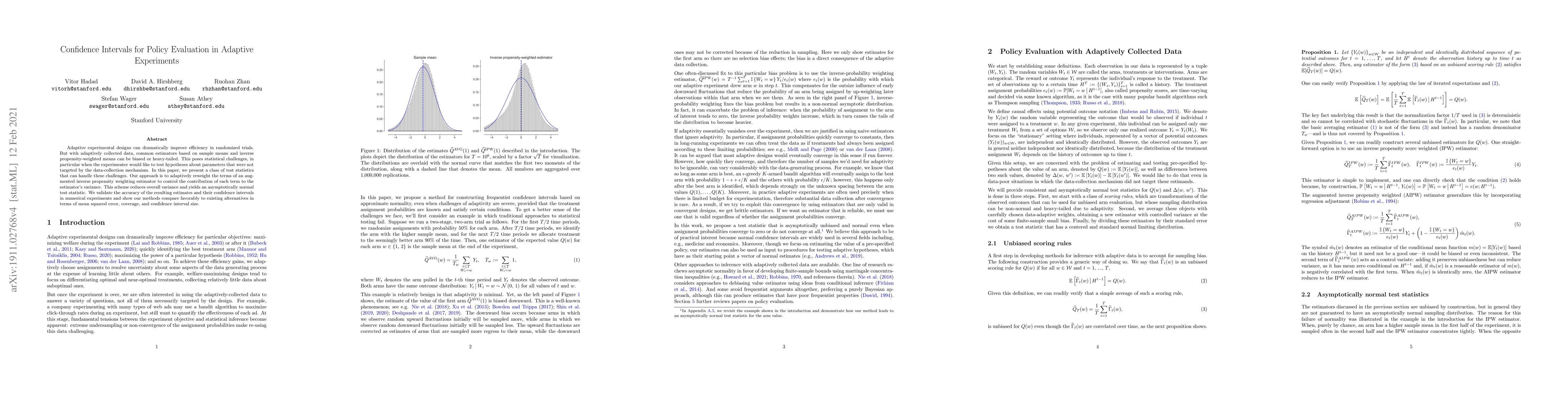 Adaptive experiment designs can dramatically improve statistical efficiency in randomized trials, but they also complicate statistical inference. For example, it is now well known that the sample mean is biased in adaptive trials. Inferential challenges are exacerbated when our parameter of interest differs from the parameter the trial was designed to target, such as when we are interested in estimating the value of a sub-optimal treatment after running a trial to determine the optimal treatment using a stochastic bandit design. In this context, typical estimators that use inverse propensity weighting to eliminate sampling bias can be problematic: their distributions become skewed and heavy-tailed as the propensity scores decay to zero. In this paper, we present a class of estimators that overcome these issues. Our approach is to adaptively reweight the terms of an augmented inverse propensity weighting estimator to control the contribution of each term to the estimator's variance. This adaptive weighting scheme prevents estimates from becoming heavy-tailed, ensuring asymptotically correct coverage. It also reduces variance, allowing us to test hypotheses with greater power - especially hypotheses that were not targeted by the experimental design. We validate the accuracy of the resulting estimates and their confidence intervals in numerical experiments and show our methods compare favorably to existing alternatives in terms of RMSE and coverage.