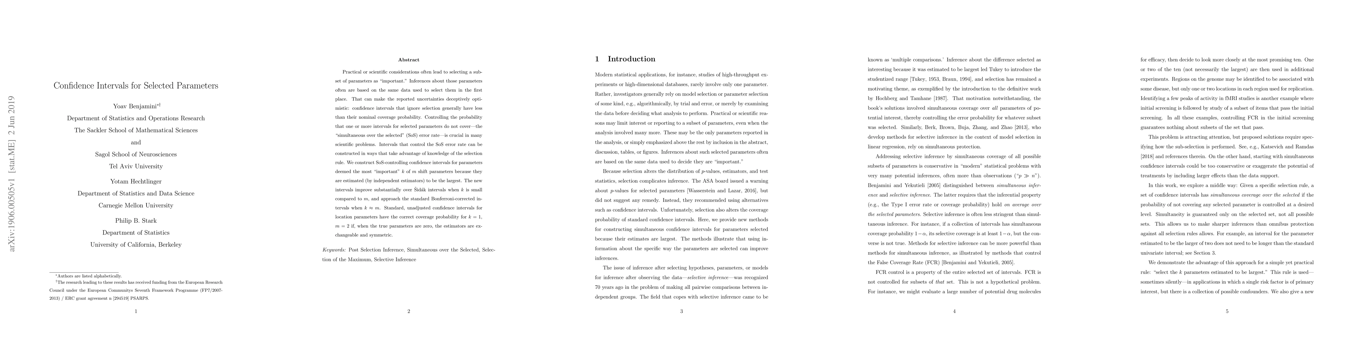 Practical or scientific considerations often lead to selecting a subset of parameters as ``important.'' Inferences about those parameters often are based on the same data used to select them in the first place. That can make the reported uncertainties deceptively optimistic: confidence intervals that ignore selection generally have less than their nominal coverage probability. Controlling the probability that one or more intervals for selected parameters do not cover---the ``simultaneous over the selected'' (SoS) error rate---is crucial in many scientific problems. Intervals that control the SoS error rate can be constructed in ways that take advantage of knowledge of the selection rule. We construct SoS-controlling confidence intervals for parameters deemed the most ``important'' $k$ of $m$ shift parameters because they are estimated (by independent estimators) to be the largest. The new intervals improve substantially over \v{S}id\'{a}k intervals when $k$ is small compared to $m$, and approach the standard Bonferroni-corrected intervals when $k \approx m$. Standard, unadjusted confidence intervals for location parameters have the correct coverage probability for $k=1$, $m=2$ if, when the true parameters are zero, the estimators are exchangeable and symmetric.