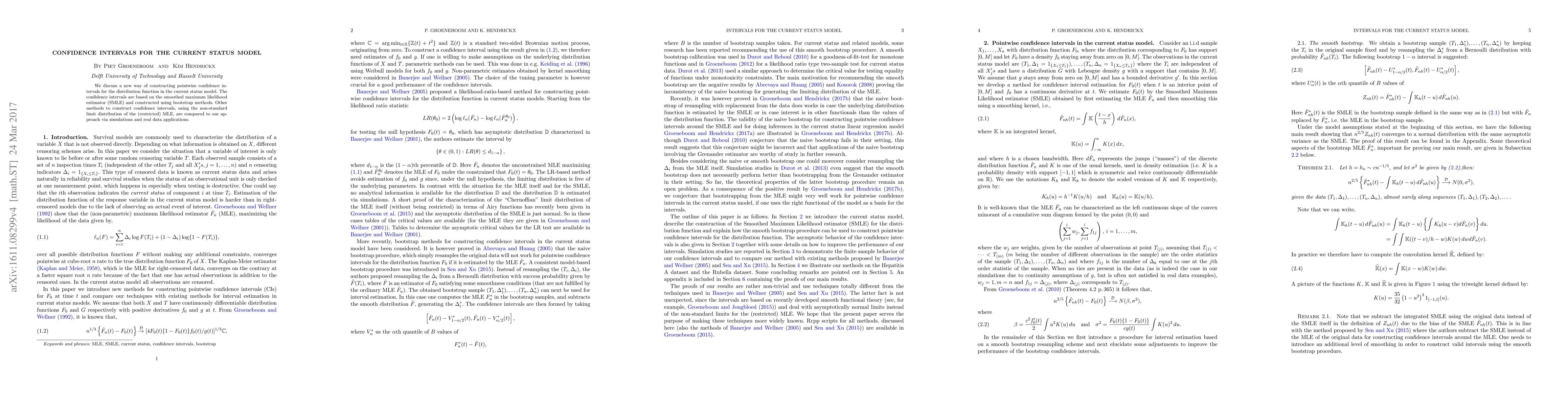 We discuss a new way of constructing pointwise confidence intervals for the distribution function in the current status model. The confidence intervals are based on the smoothed maximum likelihood estimator (SMLE) and constructed using bootstrap methods. Other methods to construct confidence intervals, using the non-standard limit distribution of the (restricted) MLE, are compared to our approach via simulations and real data applications.