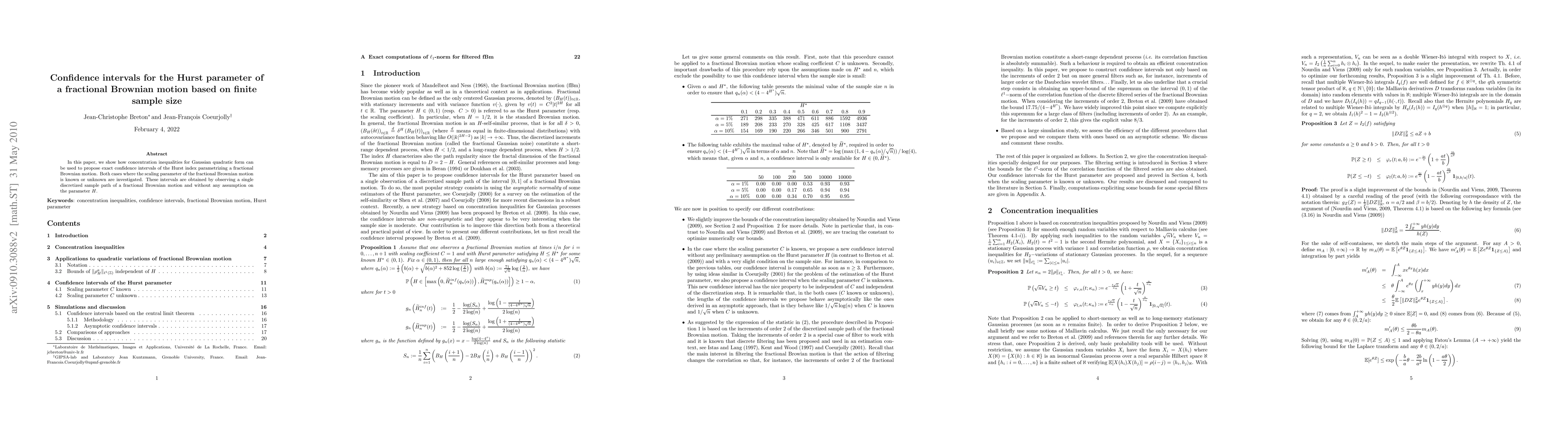 In this paper, we show how concentration inequalities for Gaussian quadratic form can be used to propose exact confidence intervals of the Hurst index parametrizing a fractional Brownian motion. Both cases where the scaling parameter of the fractional Brownian motion is known or unknown are investigated. These intervals are obtained by observing a single discretized sample path of a fractional Brownian motion and without any assumption on the parameter $H$.
