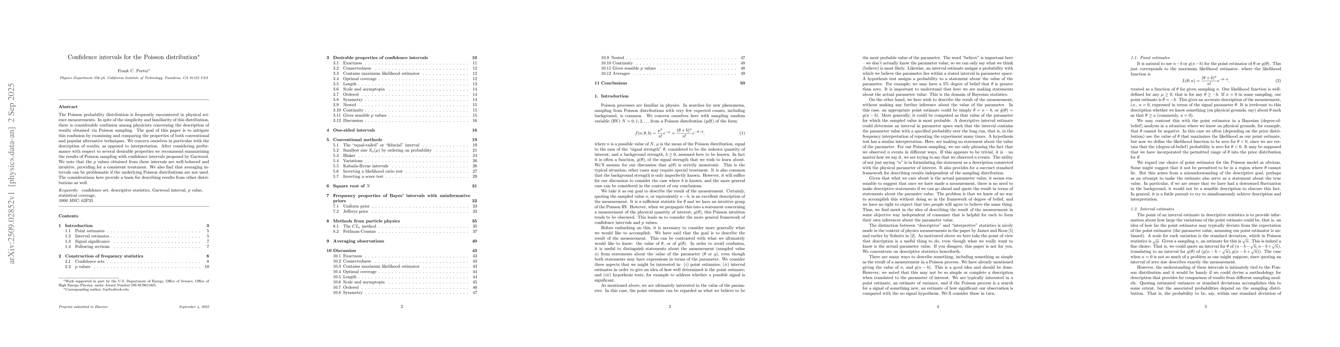 The Poisson probability distribution is frequently encountered in physical science measurements. In spite of the simplicity and familiarity of this distribution, there is considerable confusion among physicists concerning the description of results obtained via Poisson sampling. The goal of this paper is to mitigate this confusion by examining and comparing the properties of both conventional and popular alternative techniques. We concern ourselves in particular with the description of results, as opposed to interpretation. After considering performance with respect to several desirable properties we recommend summarizing the results of Poisson sampling with confidence intervals proposed by Garwood. We note that the $p$ values obtained from these intervals are well-behaved and intuitive, providing for a consistent treatment. We also find that averaging intervals can be problematic if the underlying Poisson distributions are not used. The considerations here provide a basis for describing results from other distributions as well.