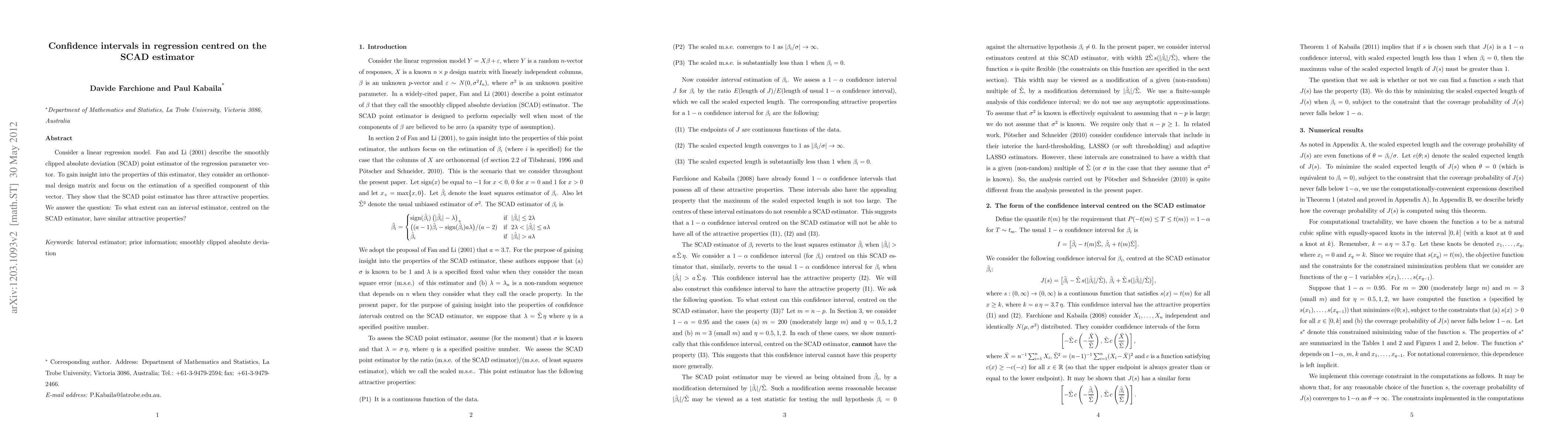 Consider a linear regression model. Fan and Li (2001) describe the smoothly clipped absolute deviation (SCAD) point estimator of the regression parameter vector. To gain insight into the properties of this estimator, they consider an orthonormal design matrix and focus on the estimation of a specified component of this vector. They show that the SCAD point estimator has three attractive properties. We answer the question: To what extent can an interval estimator, centred on the SCAD estimator, have similar attractive properties?