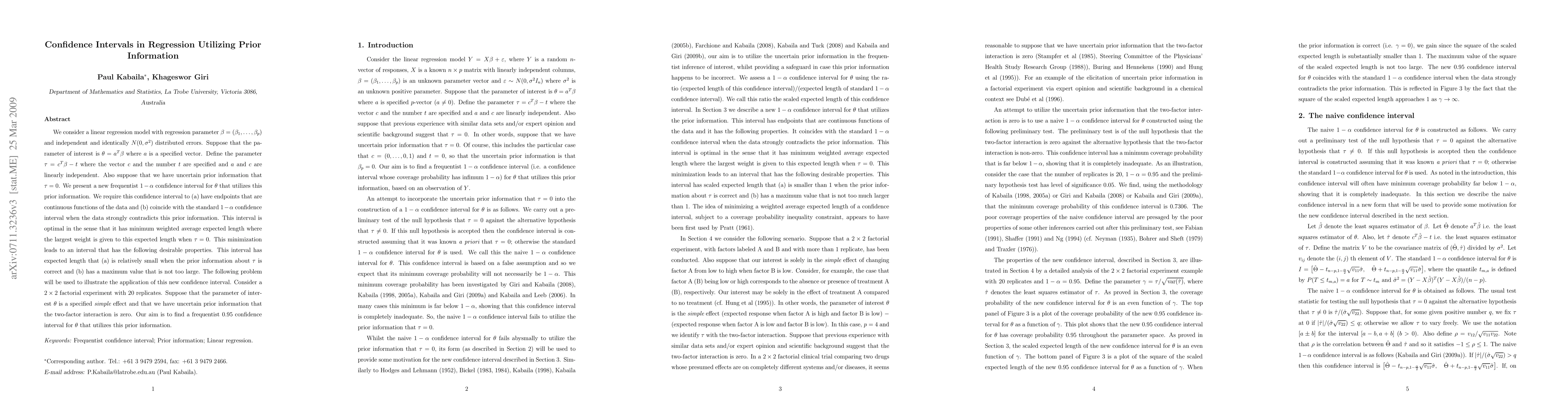 We consider a linear regression model with regression parameter beta=(beta_1,...,beta_p) and independent and identically N(0,sigma^2) distributed errors. Suppose that the parameter of interest is theta = a^T beta where a is a specified vector. Define the parameter tau=c^T beta-t where the vector c and the number t are specified and a and c are linearly independent. Also suppose that we have uncertain prior information that tau = 0. We present a new frequentist 1-alpha confidence interval for theta that utilizes this prior information. We require this confidence interval to (a) have endpoints that are continuous functions of the data and (b) coincide with the standard 1-alpha confidence interval when the data strongly contradicts this prior information. This interval is optimal in the sense that it has minimum weighted average expected length where the largest weight is given to this expected length when tau=0. This minimization leads to an interval that has the following desirable properties. This interval has expected length that (a) is relatively small when the prior information about tau is correct and (b) has a maximum value that is not too large. The following problem will be used to illustrate the application of this new confidence interval. Consider a 2-by 2 factorial experiment with 20 replicates. Suppose that the parameter of interest theta is a specified simple effect and that we have uncertain prior information that the two-factor interaction is zero. Our aim is to find a frequentist 0.95 confidence interval for theta that utilizes this prior information.