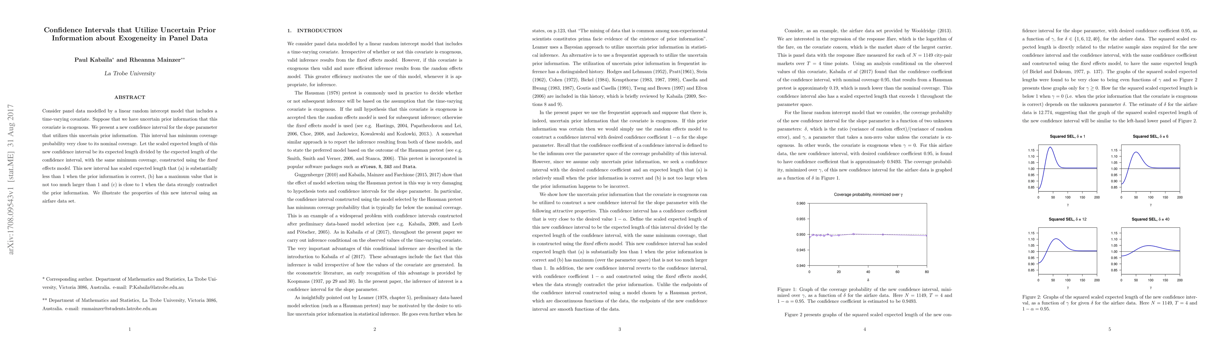 Consider panel data modelled by a linear random intercept model that includes a time-varying covariate. Suppose that we have uncertain prior information that this covariate is exogenous. We present a new confidence interval for the slope parameter that utilizes this uncertain prior information. This interval has minimum coverage probability very close to its nominal coverage. Let the scaled expected length of this new confidence interval be its expected length divided by the expected length of the confidence interval, with the same minimum coverage, constructed using the fixed effects model. This new interval has scaled expected length that (a) is substantially less than 1 when the prior information is correct, (b) has a maximum value that is not too much larger than 1 and (c) is close to 1 when the data strongly contradict the prior information. We illustrate the properties of this new interval using an airfare data set.