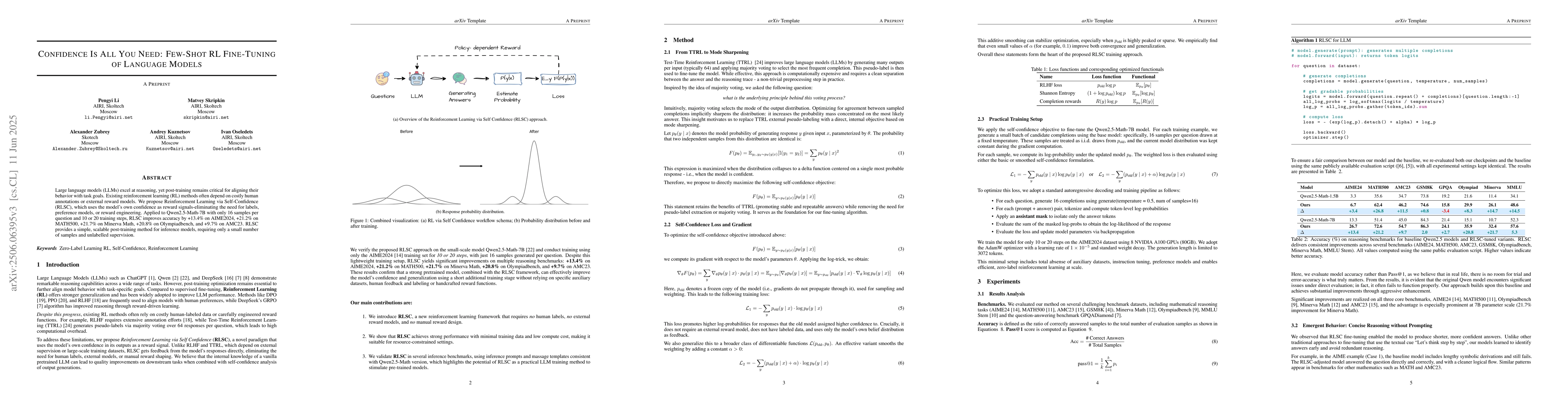 The paper introduces Reinforcement Learning via Self-Confidence (RLSC), a method that utilizes a language model's own confidence as reward signals, eliminating the need for human annotations or external reward models. Applied to Qwen2.5-Math-7B, RLSC significantly improves performance on various math benchmarks with minimal training samples and steps.