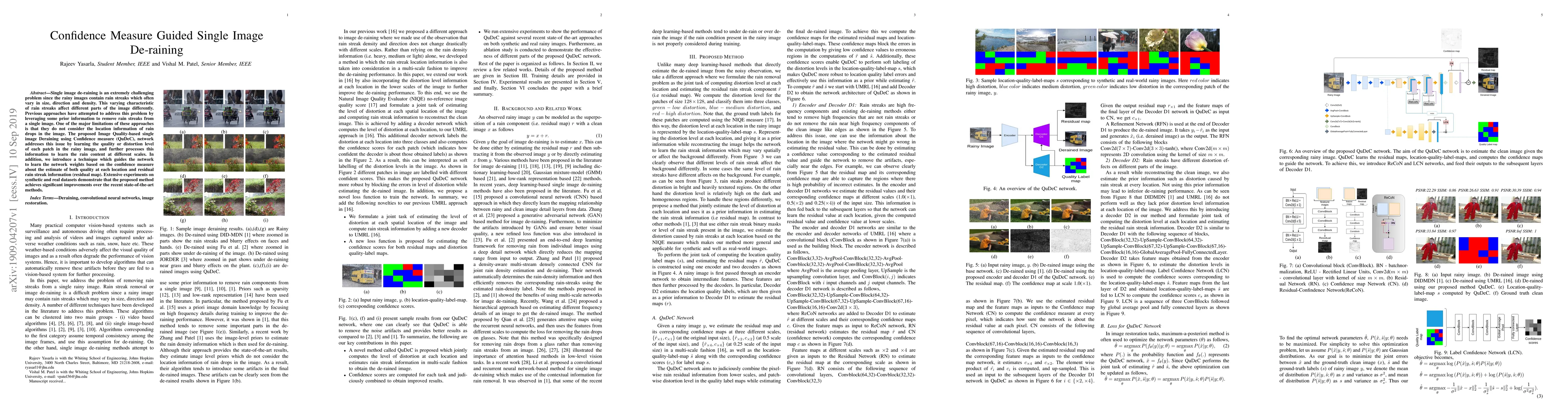 The paper proposes a novel QuDeC network for single image de-raining that uses confidence measures to assess image quality and residual rain streaks, improving upon previous methods by incorporating location-specific rain drop information. The method demonstrates superior performance compared to state-of-the-art techniques on both synthetic and real datasets.