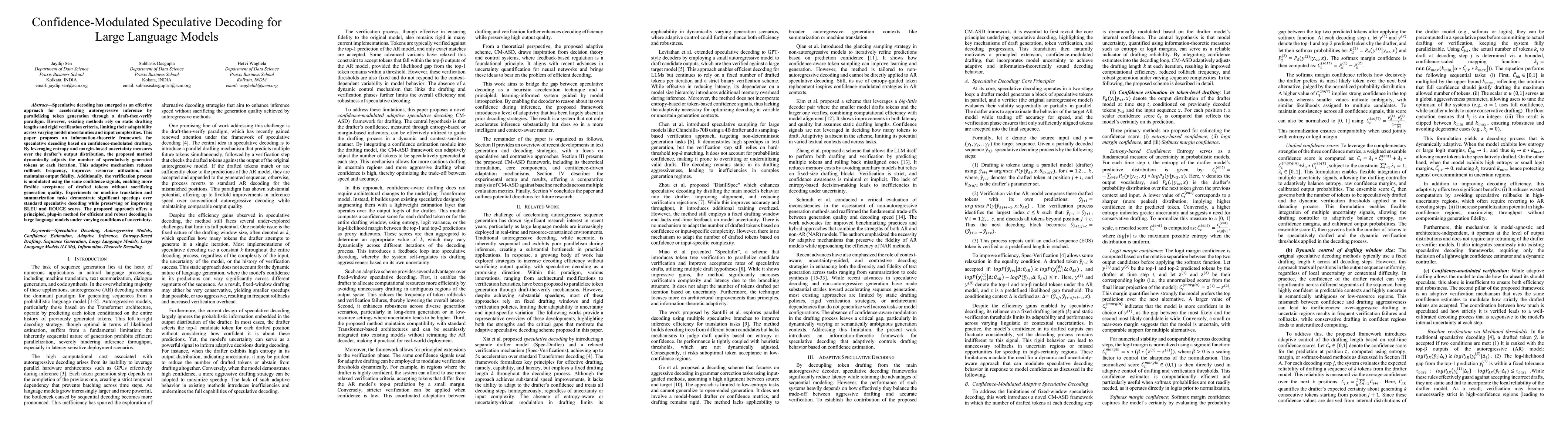 Speculative decoding has emerged as an effective approach for accelerating autoregressive inference by parallelizing token generation through a draft-then-verify paradigm. However, existing methods rely on static drafting lengths and rigid verification criteria, limiting their adaptability across varying model uncertainties and input complexities. This paper proposes an information-theoretic framework for speculative decoding based on confidence-modulated drafting. By leveraging entropy and margin-based uncertainty measures over the drafter's output distribution, the proposed method dynamically adjusts the number of speculatively generated tokens at each iteration. This adaptive mechanism reduces rollback frequency, improves resource utilization, and maintains output fidelity. Additionally, the verification process is modulated using the same confidence signals, enabling more flexible acceptance of drafted tokens without sacrificing generation quality. Experiments on machine translation and summarization tasks demonstrate significant speedups over standard speculative decoding while preserving or improving BLEU and ROUGE scores. The proposed approach offers a principled, plug-in method for efficient and robust decoding in large language models under varying conditions of uncertainty.