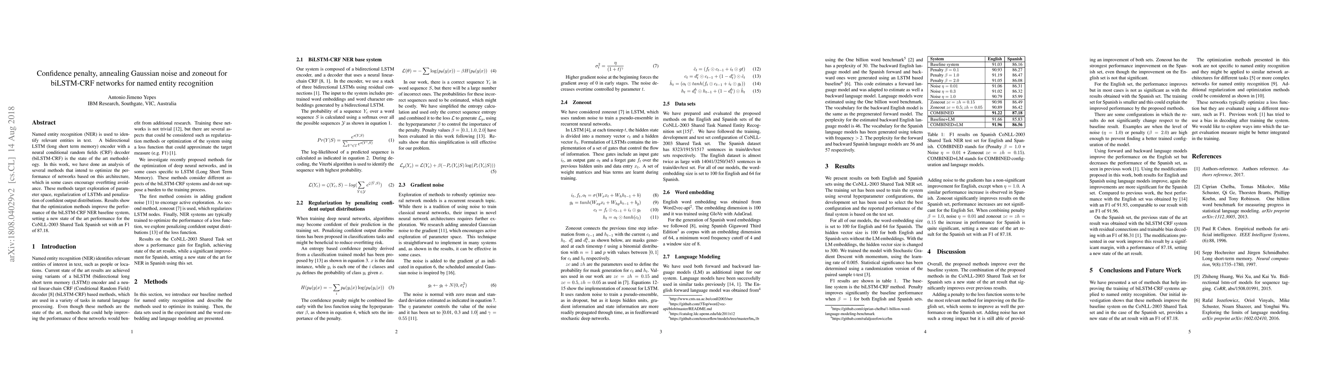 This paper investigates optimization techniques for biLSTM-CRF networks used in named entity recognition, focusing on confidence penalty, Gaussian noise annealing, and zoneout. The proposed methods enhance model performance, achieving a new state-of-the-art F1 score of 87.18 on the CoNLL-2003 Spanish dataset.