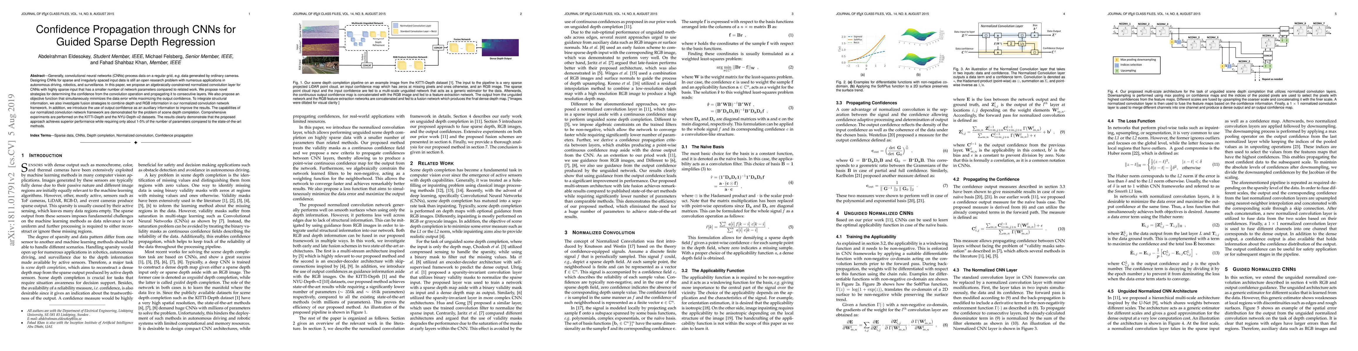 Generally, convolutional neural networks (CNNs) process data on a regular grid, e.g. data generated by ordinary cameras. Designing CNNs for sparse and irregularly spaced input data is still an open research problem with numerous applications in autonomous driving, robotics, and surveillance. In this paper, we propose an algebraically-constrained normalized convolution layer for CNNs with highly sparse input that has a smaller number of network parameters compared to related work. We propose novel strategies for determining the confidence from the convolution operation and propagating it to consecutive layers. We also propose an objective function that simultaneously minimizes the data error while maximizing the output confidence. To integrate structural information, we also investigate fusion strategies to combine depth and RGB information in our normalized convolution network framework. In addition, we introduce the use of output confidence as an auxiliary information to improve the results. The capabilities of our normalized convolution network framework are demonstrated for the problem of scene depth completion. Comprehensive experiments are performed on the KITTI-Depth and the NYU-Depth-v2 datasets. The results clearly demonstrate that the proposed approach achieves superior performance while requiring only about 1-5% of the number of parameters compared to the state-of-the-art methods.