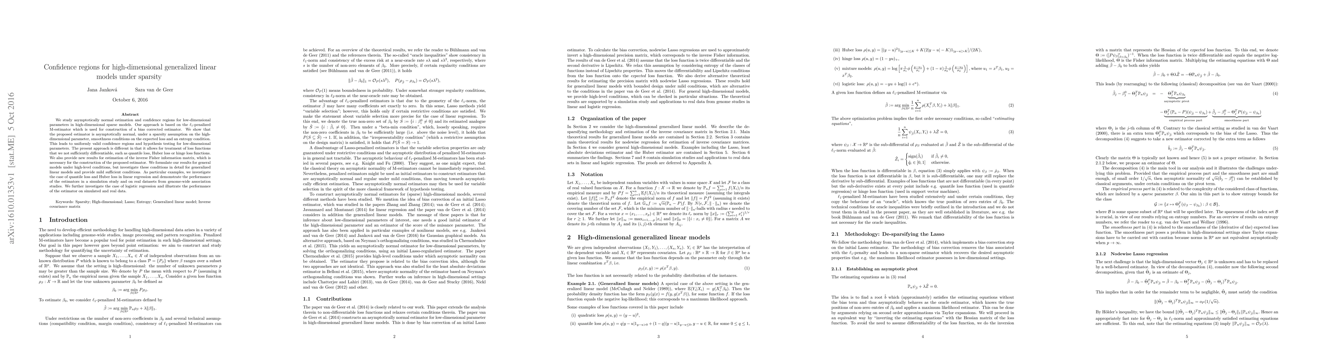 This paper develops asymptotically normal estimators and confidence regions for low-dimensional parameters in high-dimensional sparse generalized linear models using $\ell_1$-penalized M-estimators. It demonstrates the method's applicability to non-differentiable loss functions and provides a simulation study and real data analysis to validate its performance.