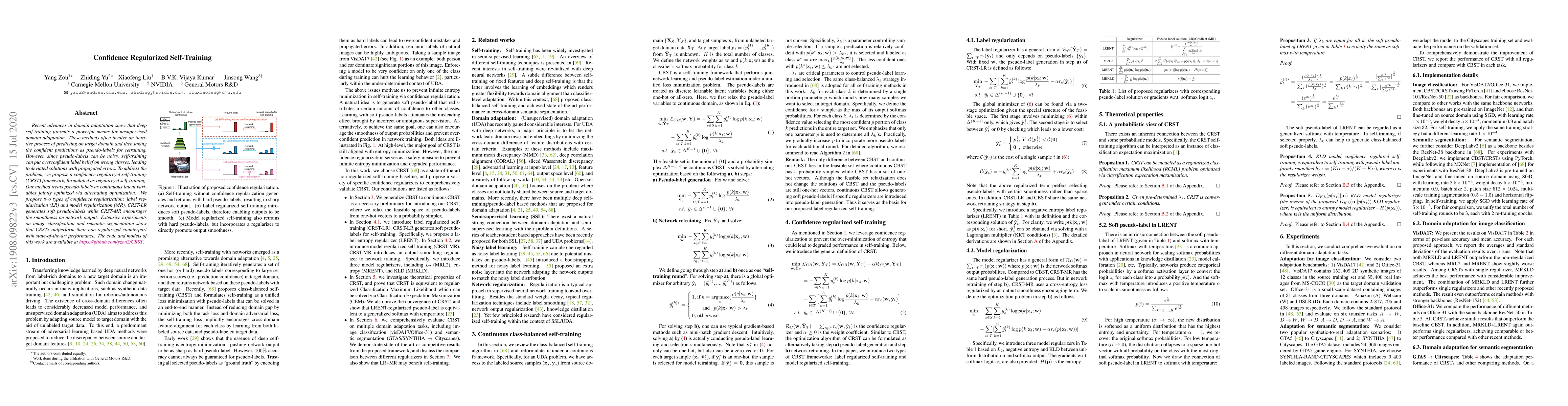 A new method called Confidence Regularized Self-Training (CRST) improves self-training for unsupervised domain adaptation by incorporating confidence regularization, achieving state-of-the-art performance in image classification and semantic segmentation.