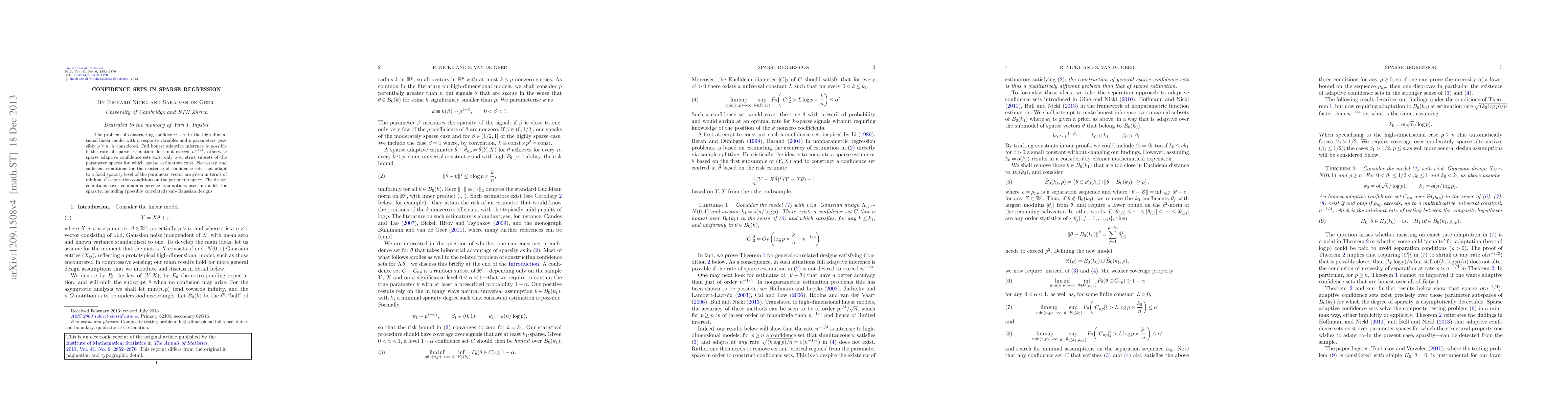 This paper explores the construction of confidence sets in high-dimensional sparse regression, where the number of parameters may exceed the number of observations. It provides necessary and sufficient conditions for the existence of such confidence sets, establishing that full honest adaptive inference is feasible only if the sparsity level is sufficiently low.