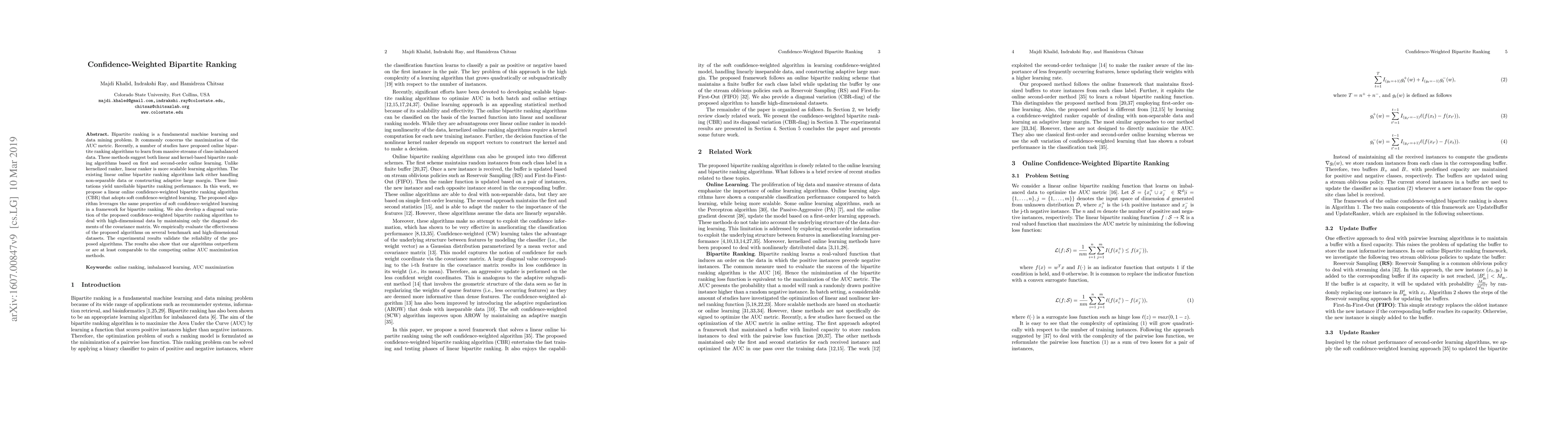 This paper proposes a linear online confidence-weighted bipartite ranking algorithm (CBR) to improve the performance of linear ranking methods on class-imbalanced data streams. The proposed method outperforms existing algorithms by handling non-separable data and constructing adaptive large margins, validated through empirical evaluations on benchmark datasets.